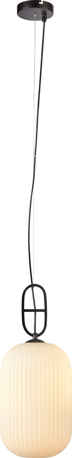 Светильник состоит из металлического основания и стеклянного абажура белого цвета с рельефным узором. К подвесу подходят лампы с цоколем Е27, максимальной мощностью 40 Вт.
