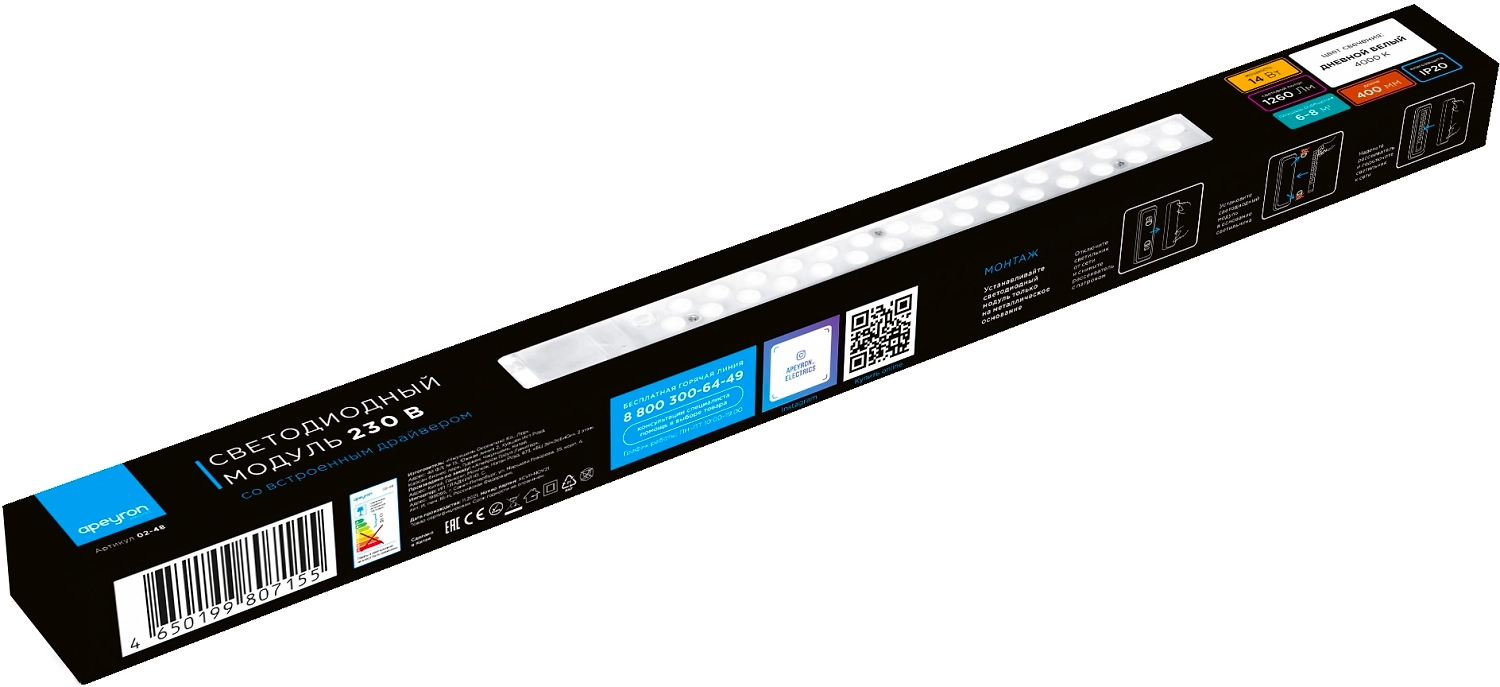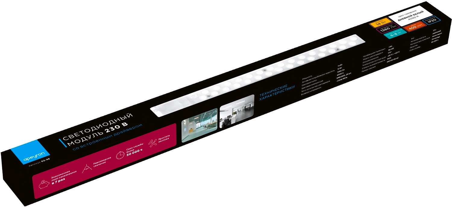 - - Светодиодный модуль имеет прямоугольную форму с размером 400х32 мм и толщиной драйвера 26 мм.