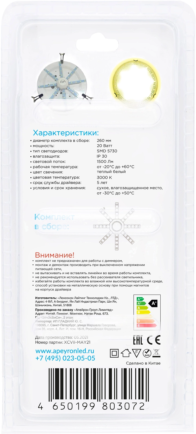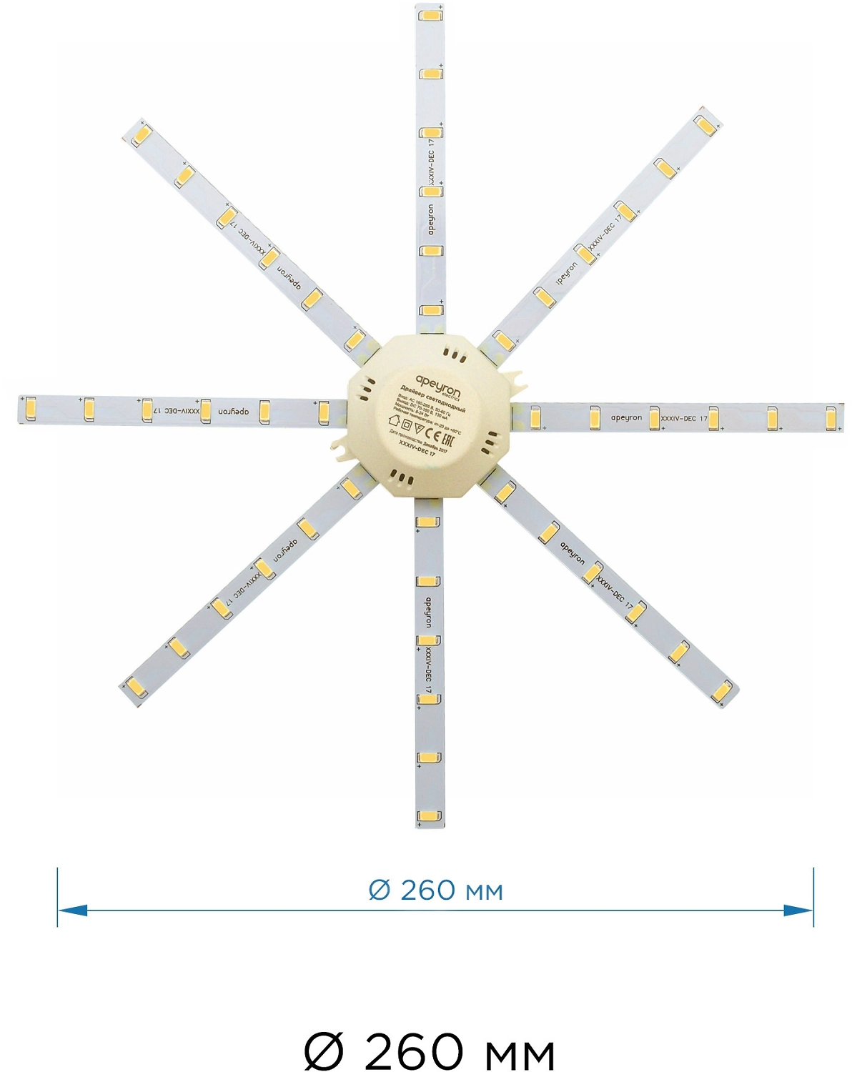 - - Набор светодиодных линеек в собранном виде имеет круглую форму и соответствует размеру с диаметром 260 мм и толщиной драйвера 22,5 мм.