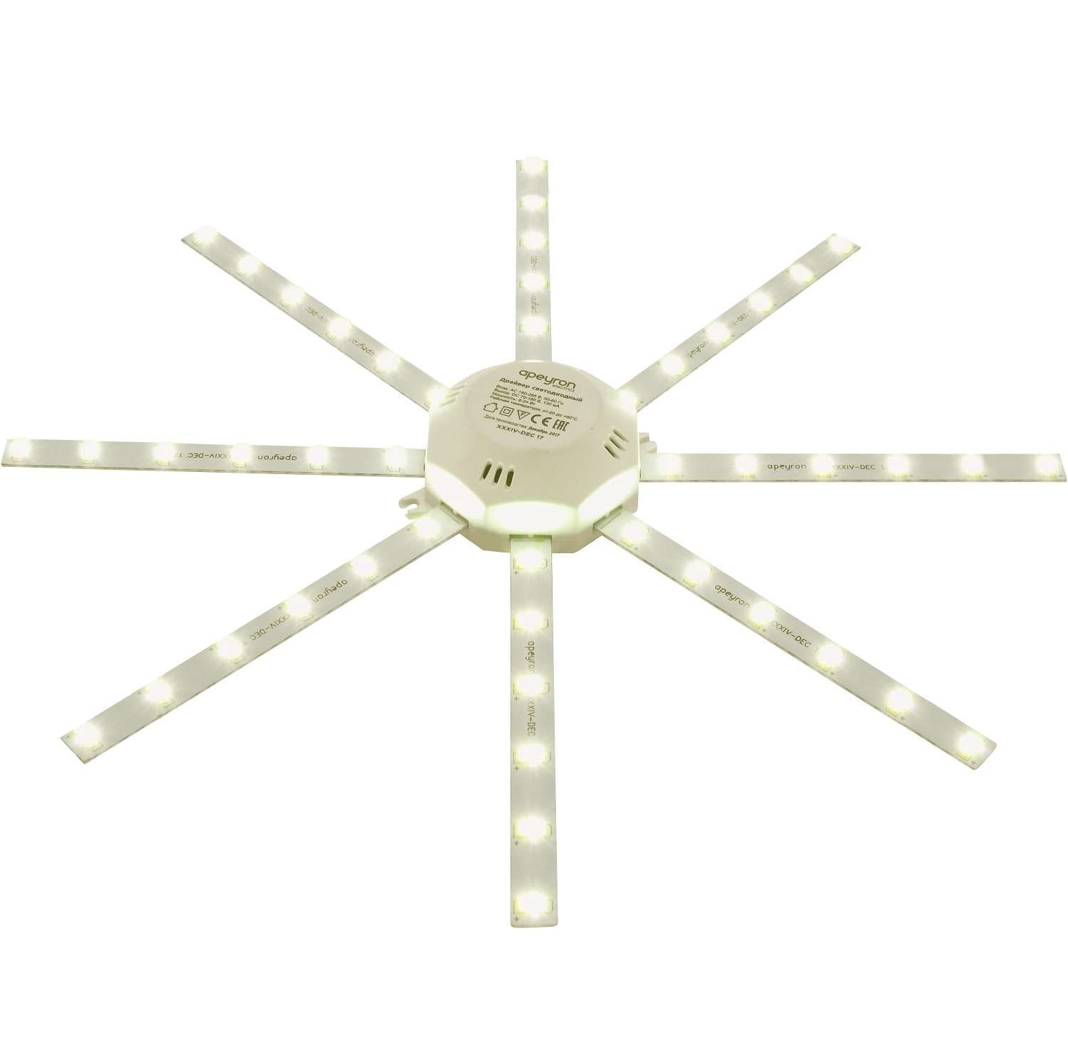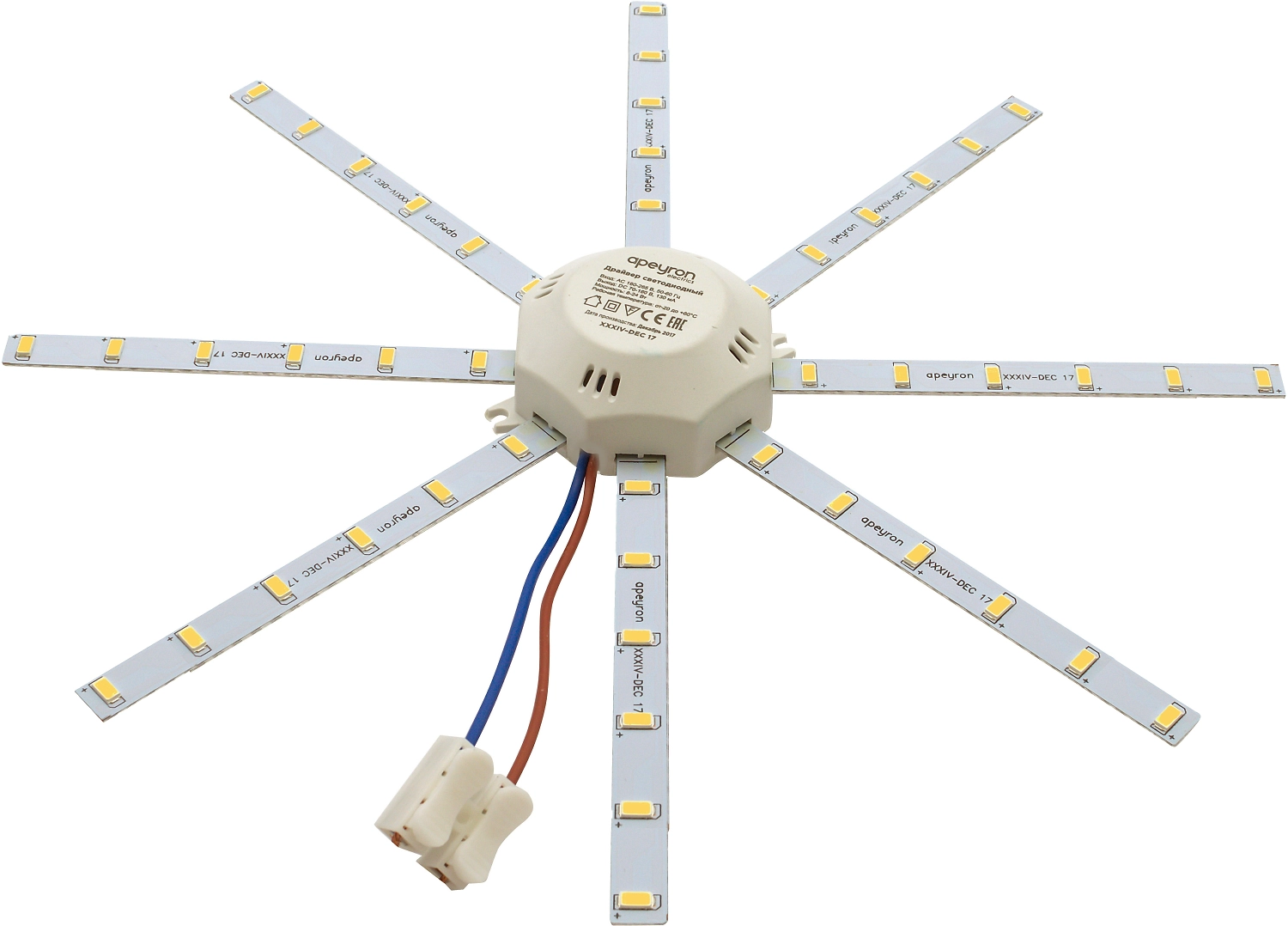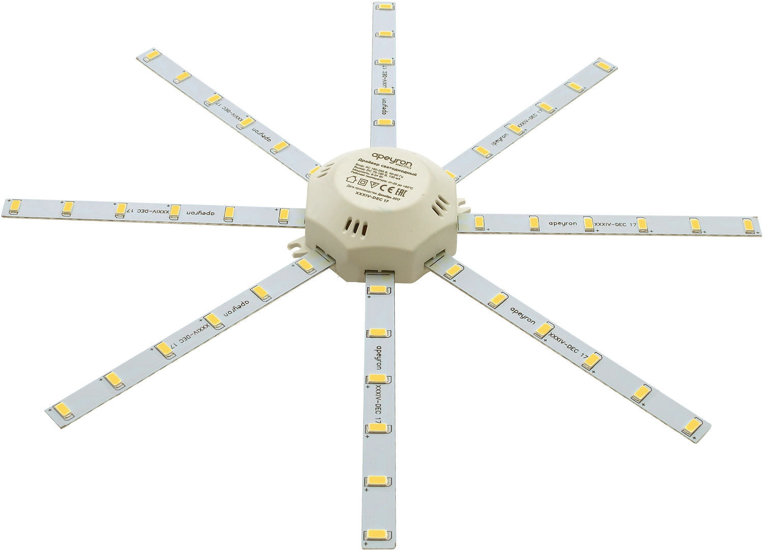 Комплект светодиодных линеек "Звездочка" с артикулом 02-45 предназначен для замены стандартных ламп, а также современных светодиодных источников свечения, которые уже повсеместно используются в настенно-потолочных светильниках. Благодаря конструкции этого комплекта плафон светильника будет светиться на все 100 %, а уровень освещенности повысится даже по сравнению со светодиодными лампами аналогичной мощности. Благодаря большей площади охлаждения срок службы будет в разы больше.