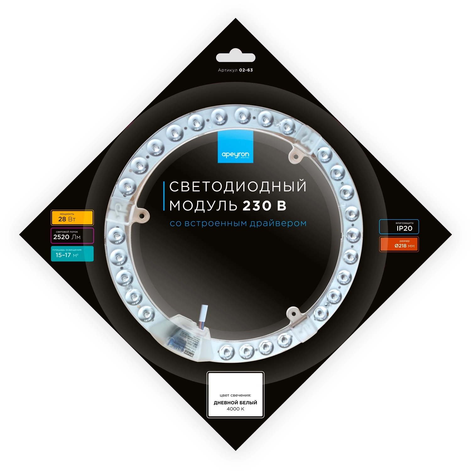 - - Светодиодный модуль имеет круглую форму с диаметром 218 мм и толщиной драйвера 16 мм.