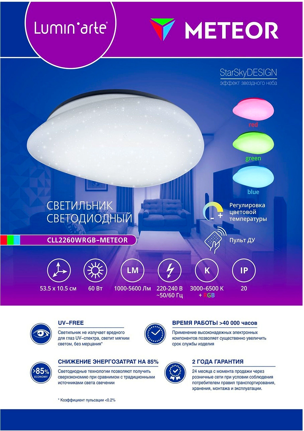 Благодаря настенно-потолочному светодиодному светильнику Meteor 60 W торговой марки Luminarte интерьер заиграет новыми красками: в зависимости от вашего настроения обычная комната превратится в