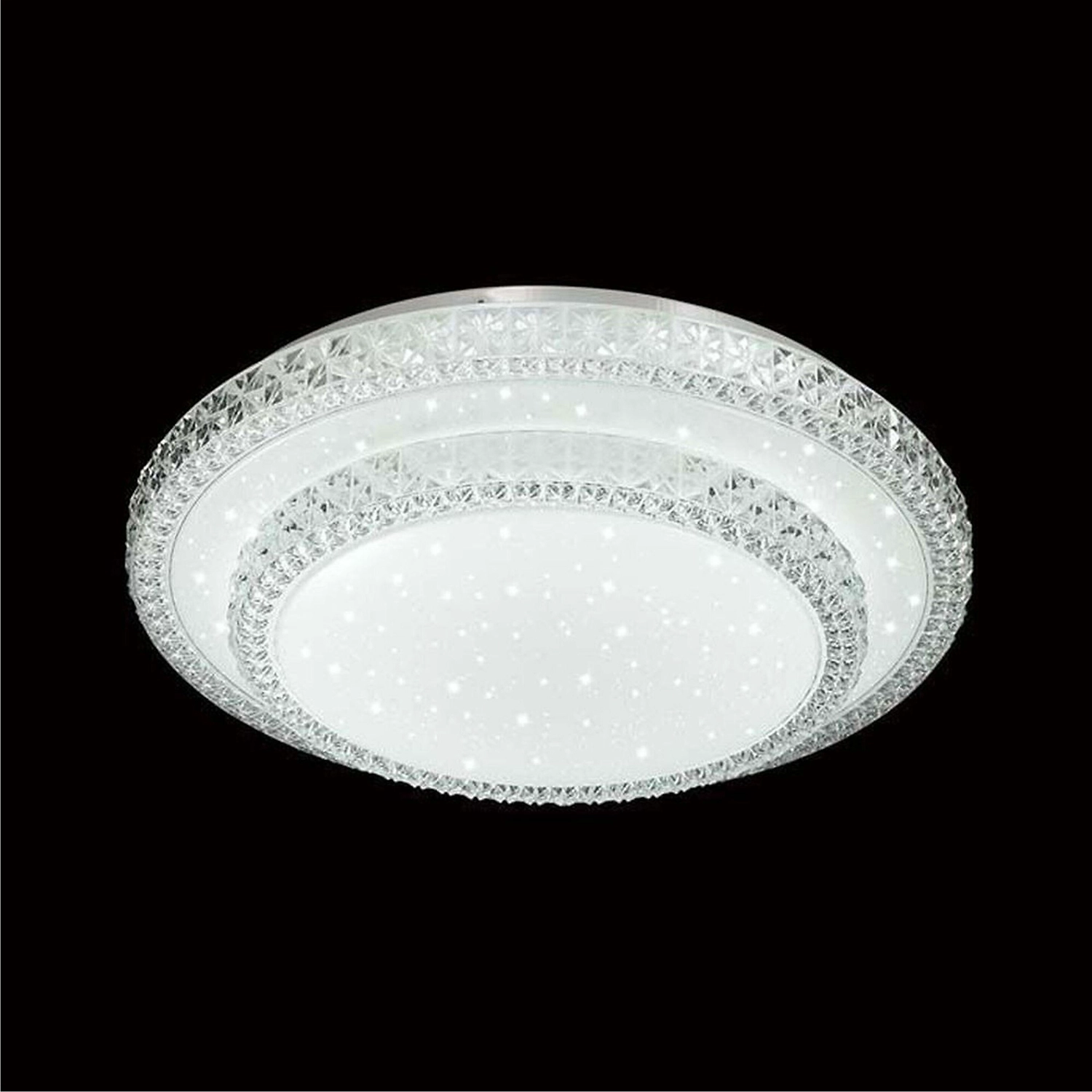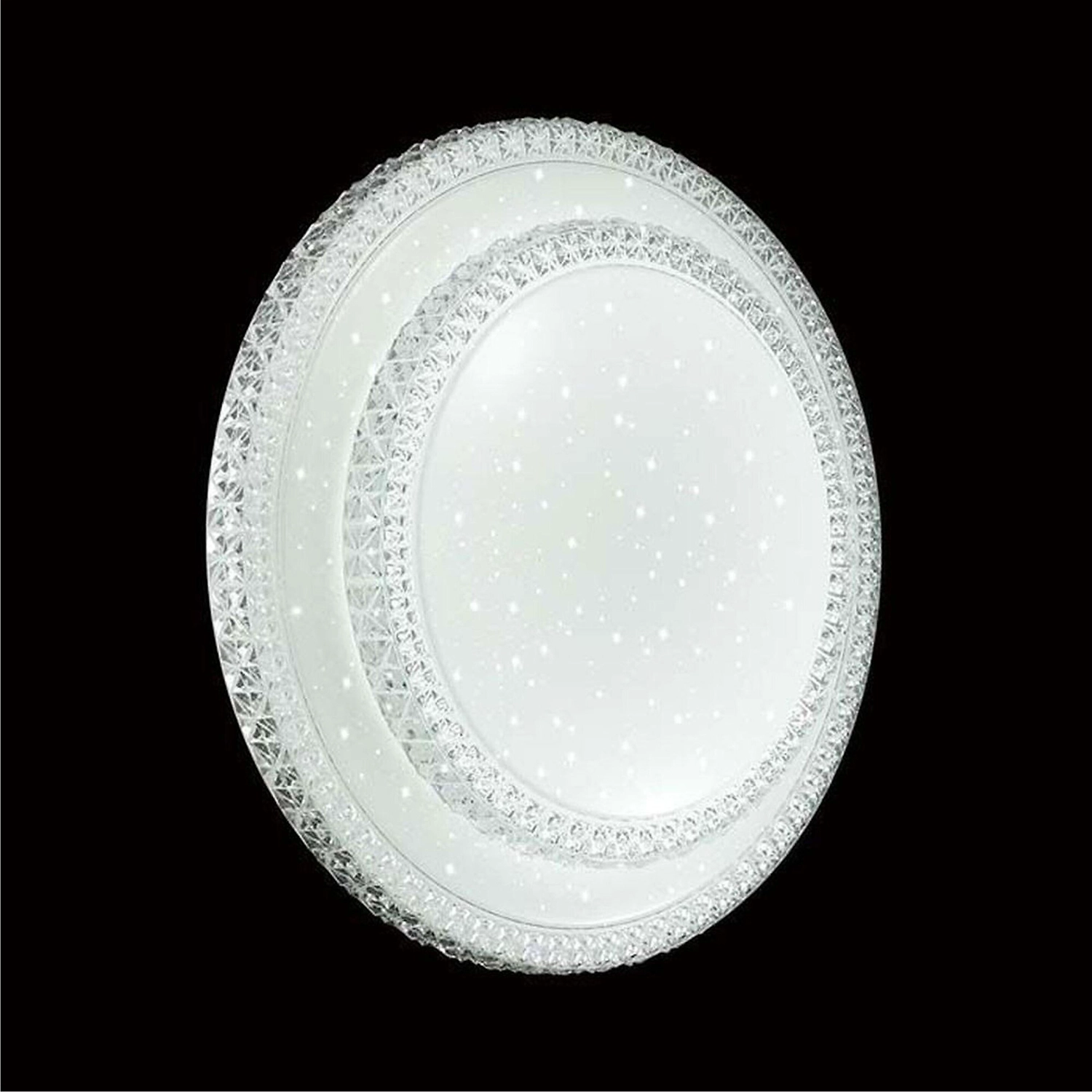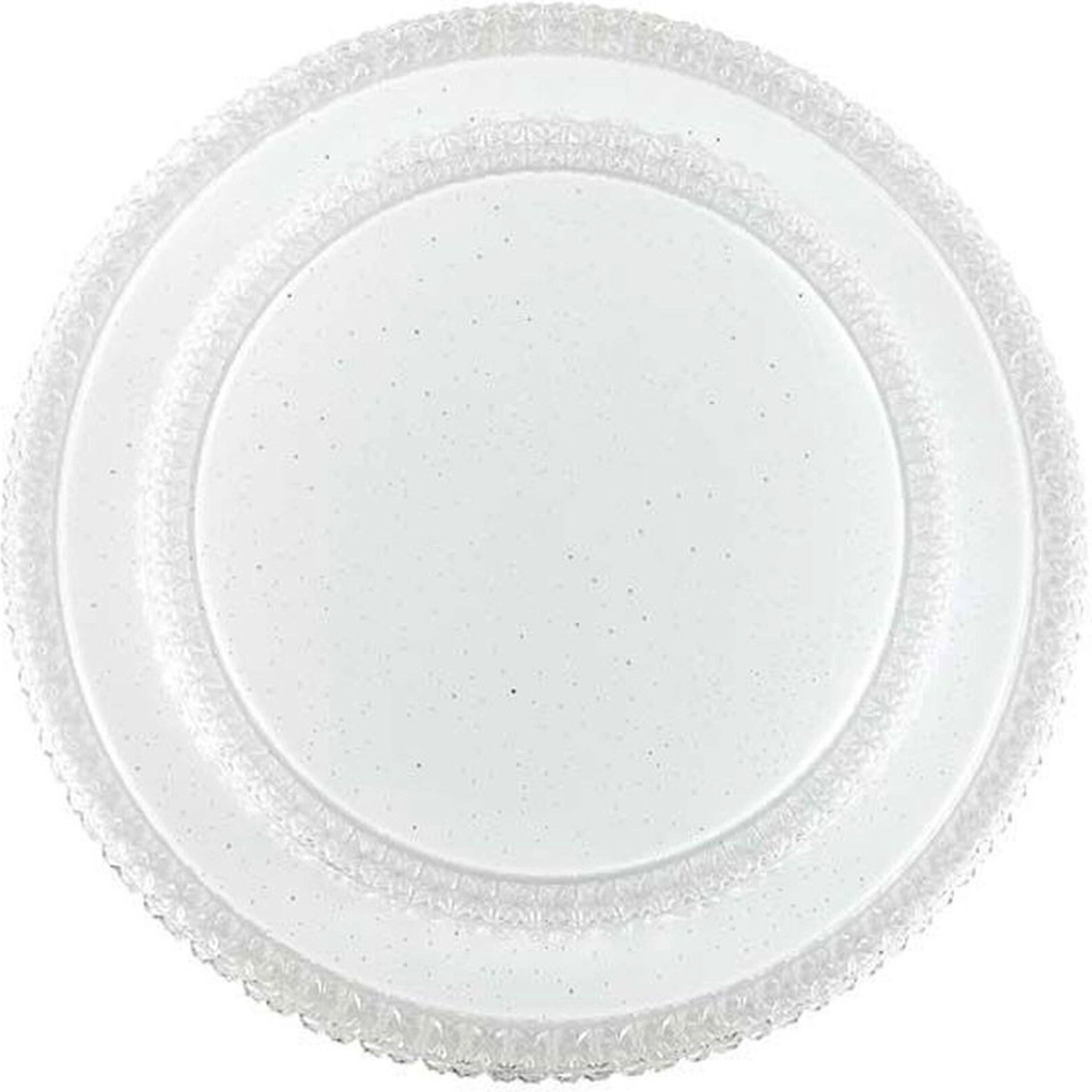 Светильник 2041/EL линии FLOORS состоит из металлического основания (базы) и пластикового рассеивателя. Материал рассеивателя - высококачественный акрил белого цвета с глянцевой поверхностью, обеспечивающий светильнику равномерное рассеивание и хорошее светопропускание. Форма плафона: круглая, декорирована рельефным, прозрачным ободом с эффектом переливания, а также прозрачными точками, придающими включенному светильнику красивый эффект звездного мерцани". Степень защиты IP43 позволяет использовать светильник в определенных зонах влажных помещений. В комплект входит заменяемый LED модуль с линзами, мощностью 72Вт, которая соответствует лампе накаливания 520Вт. А также пульт ДУ, с помощью которого осуществляется плавное изменение цветовой температуры 3000-6000К, изменение яркости, переход в режим переключения теплого/белого/холодного/ночного света. Светильник имеет функцию память.