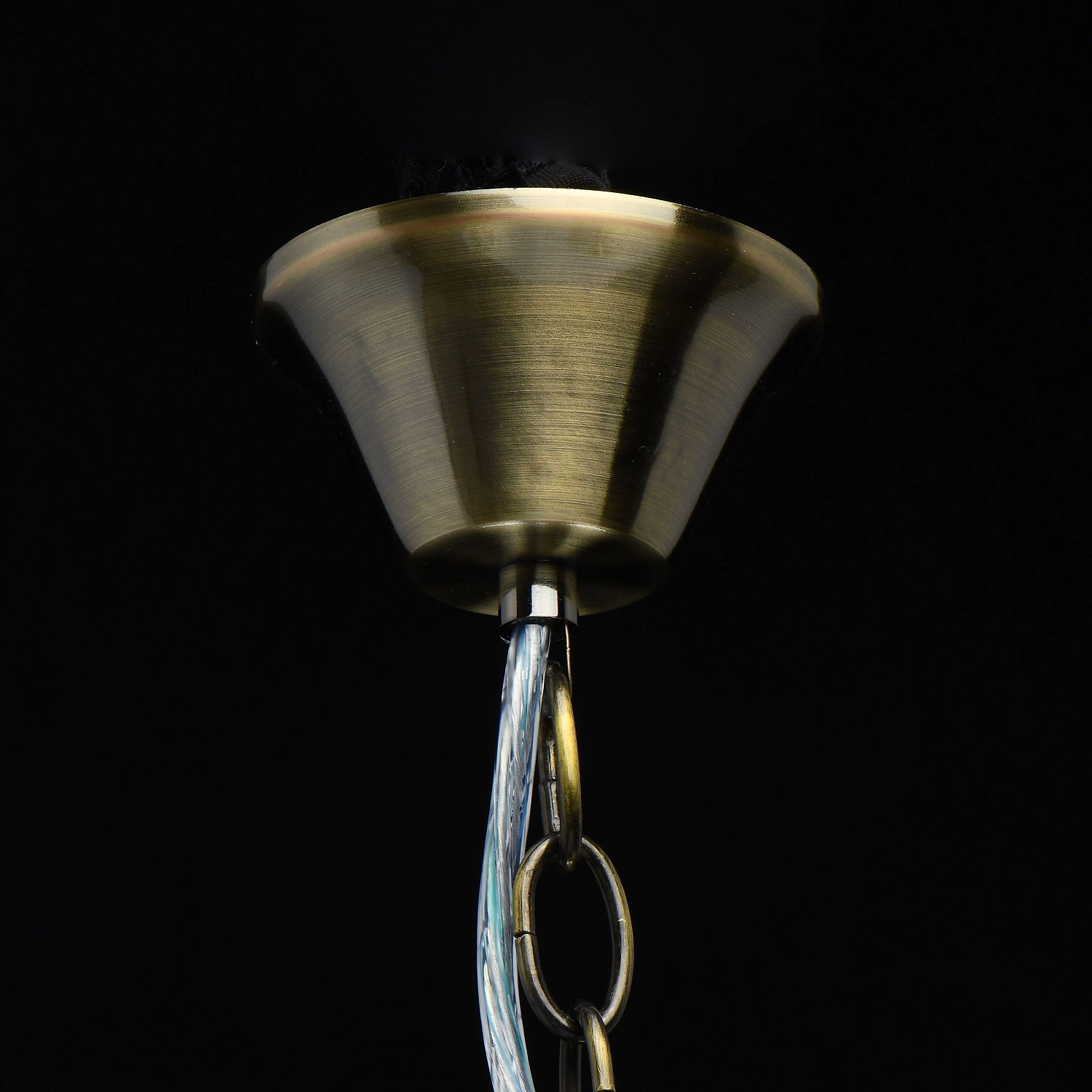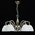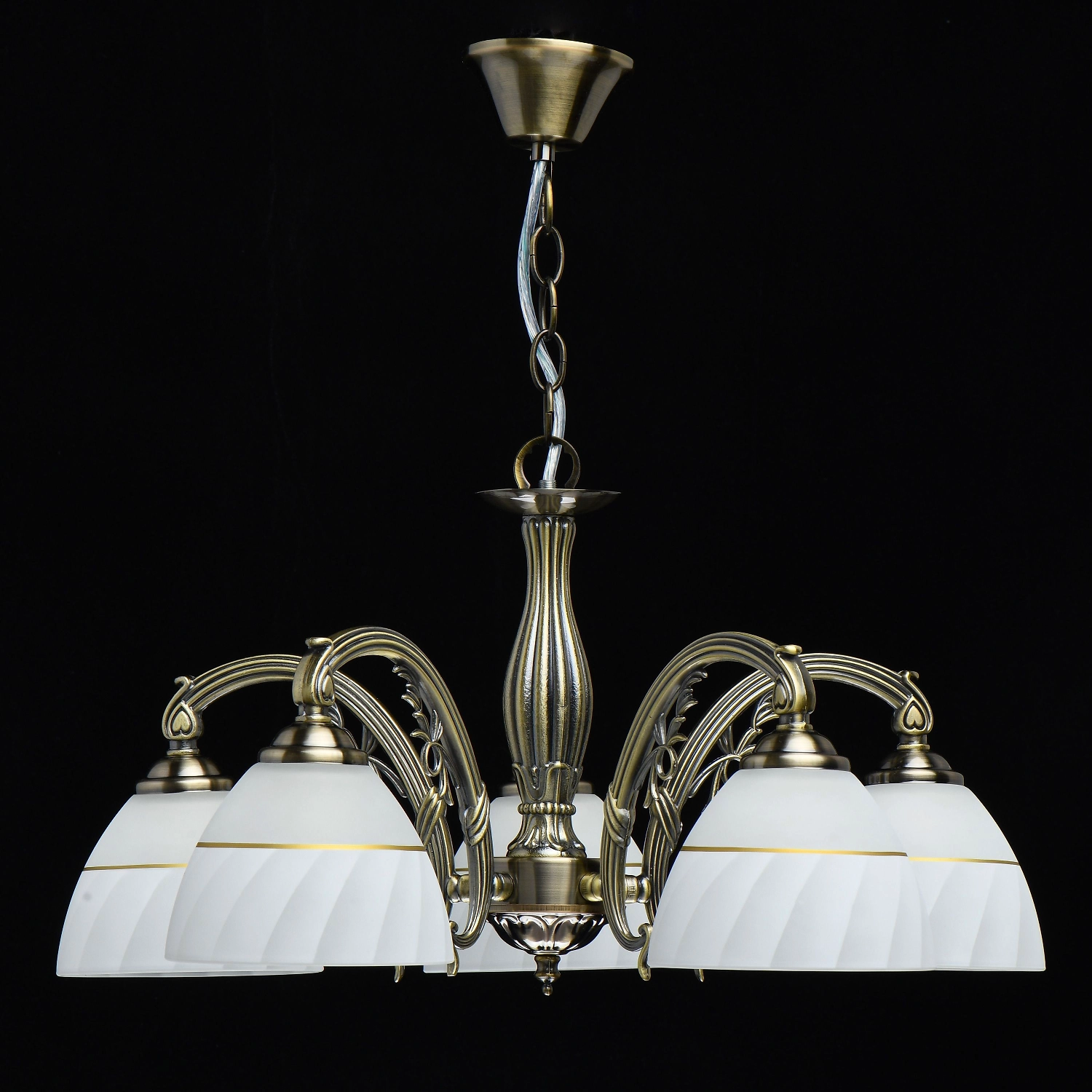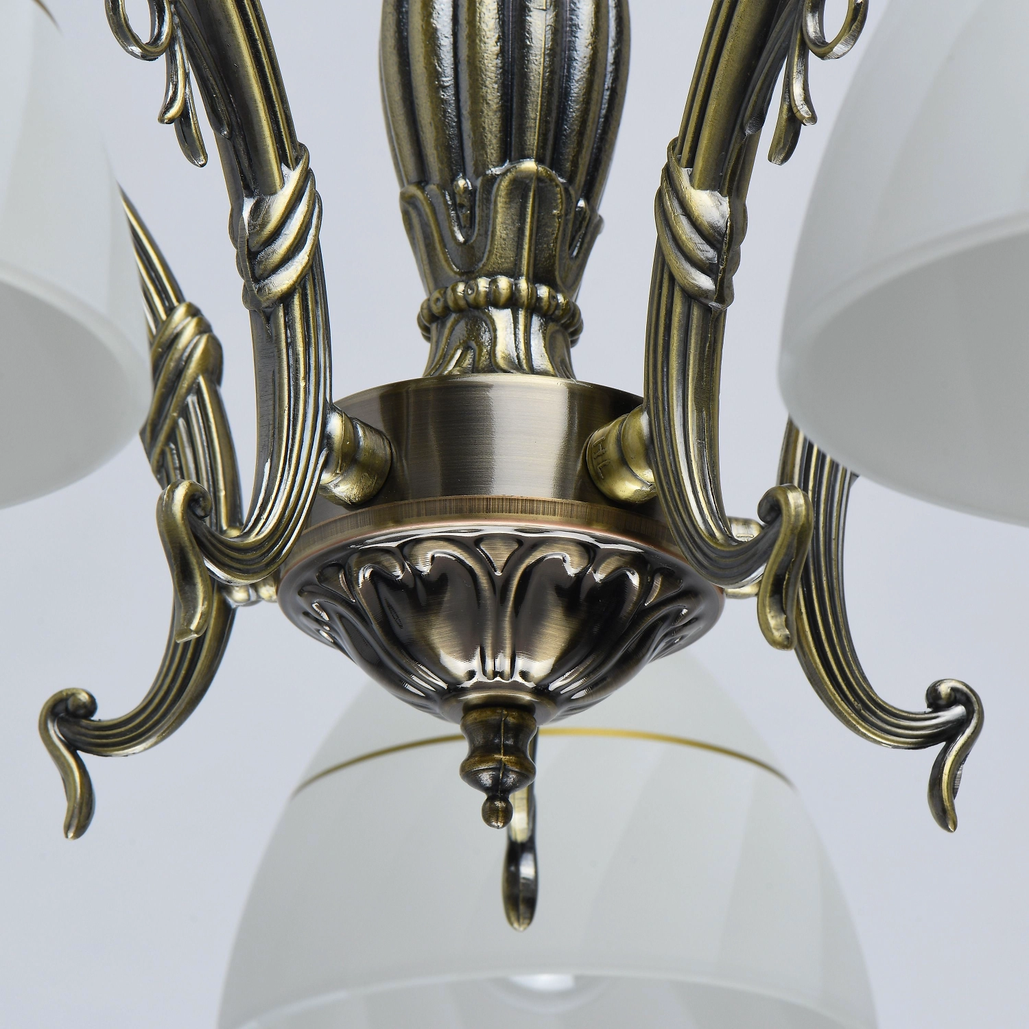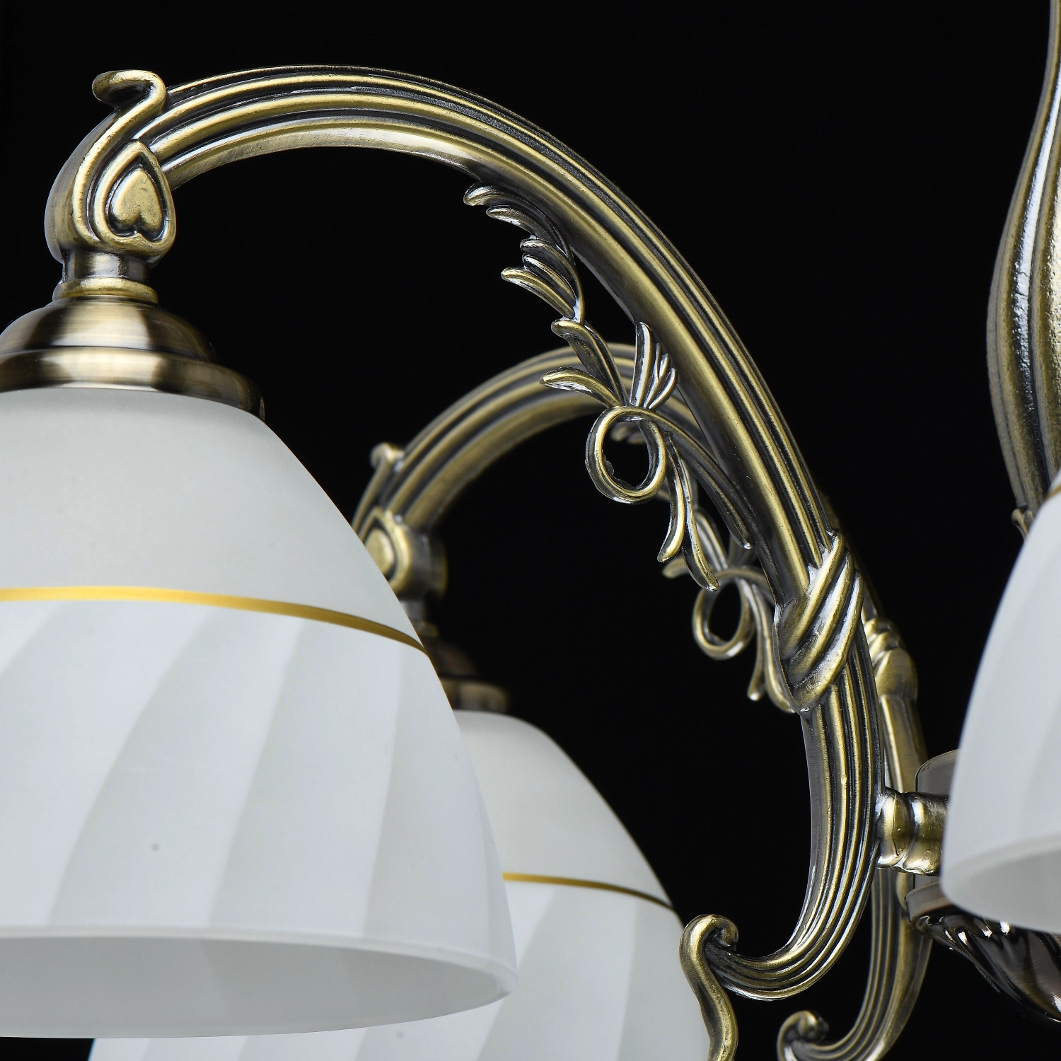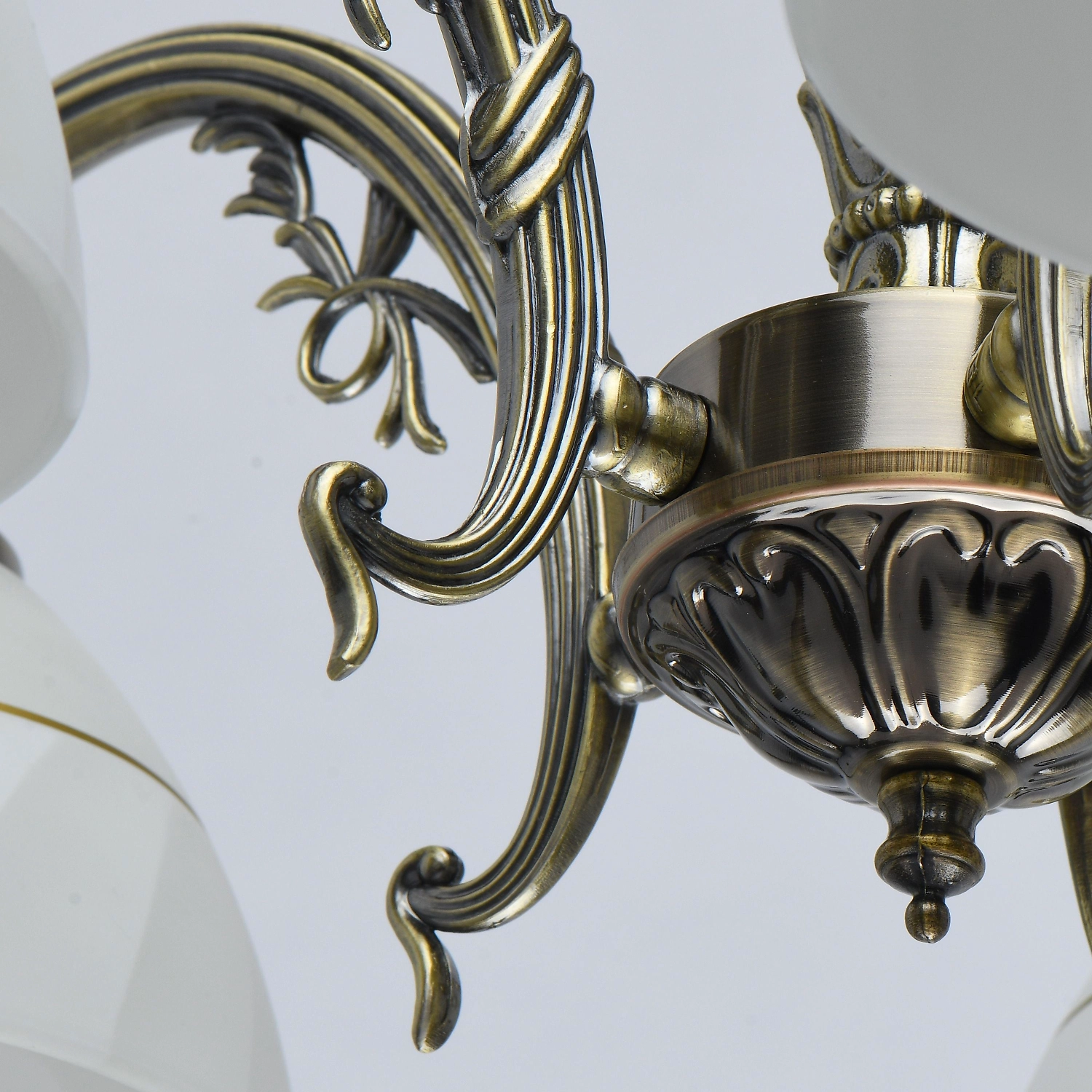 Популярный цвет античной бронзы основания светильника. Белые плафоны с декоративным кантом направлены вниз. Декор из художественного литья на рожках и основания модели.