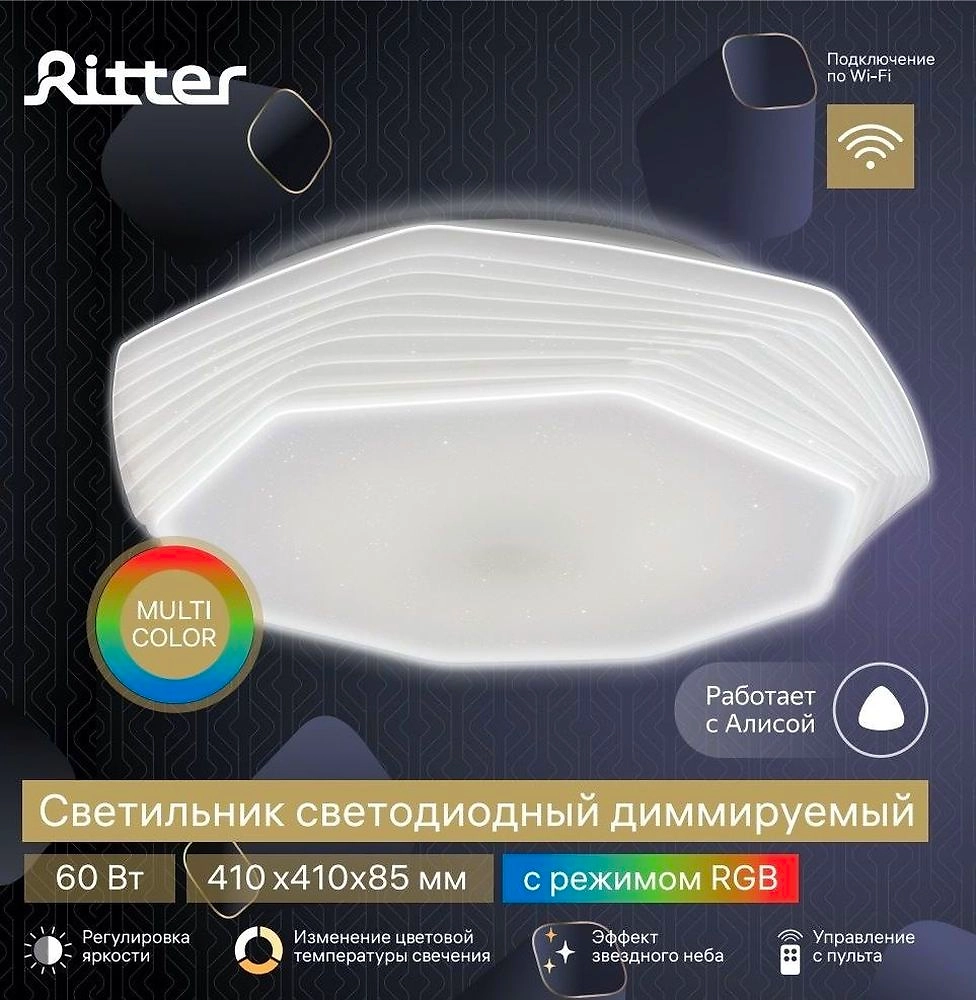 Светильник Ritter Mira поможет создать в интерьере любое настроение за счет изменения цветовой температуры и яркости свечения. Невероятный эффект "звездное небо" украсит долгие вечера, порадует детей и взрослых своим магическим мерцанием.