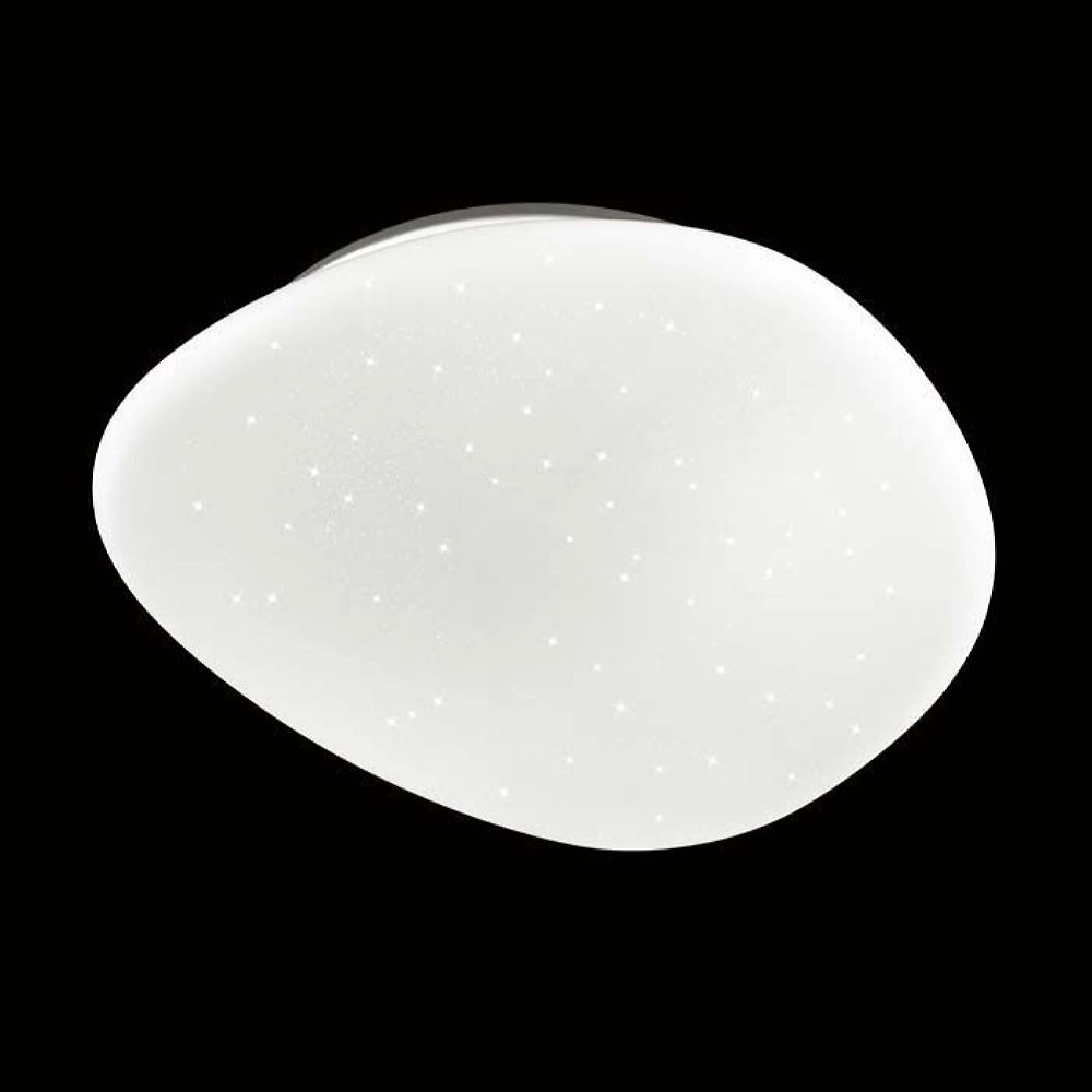 Светильник 2039/DL линии STONE состоит из металлического основания (базы) и пластикового рассеивателя. Материал рассеивателя - высококачественный акрил белого цвета с глянцевой поверхностью, обеспечивающий светильнику равномерное рассеивание и хорошее светопропускание. Форма плафона: индивидуальная и необычная - имитирует камень, декорирована прозрачными точками, придающими включенному светильнику красивый эффект "звездного мерцания" и переливания. Степень защиты IP43 позволяет использовать светильник в определенных зонах влажных помещений. В комплект входит заменяемый LED модуль с линзами, мощностью 48Вт, которая соответствует лампе накаливания 350Вт. А также пульт ДУ, с помощью которого осуществляется плавное изменение цветовой температуры 3000-6000К, изменение яркости, переход в режим переключения теплого/белого/холодного/ночного света. Светильник имеет функцию "память".