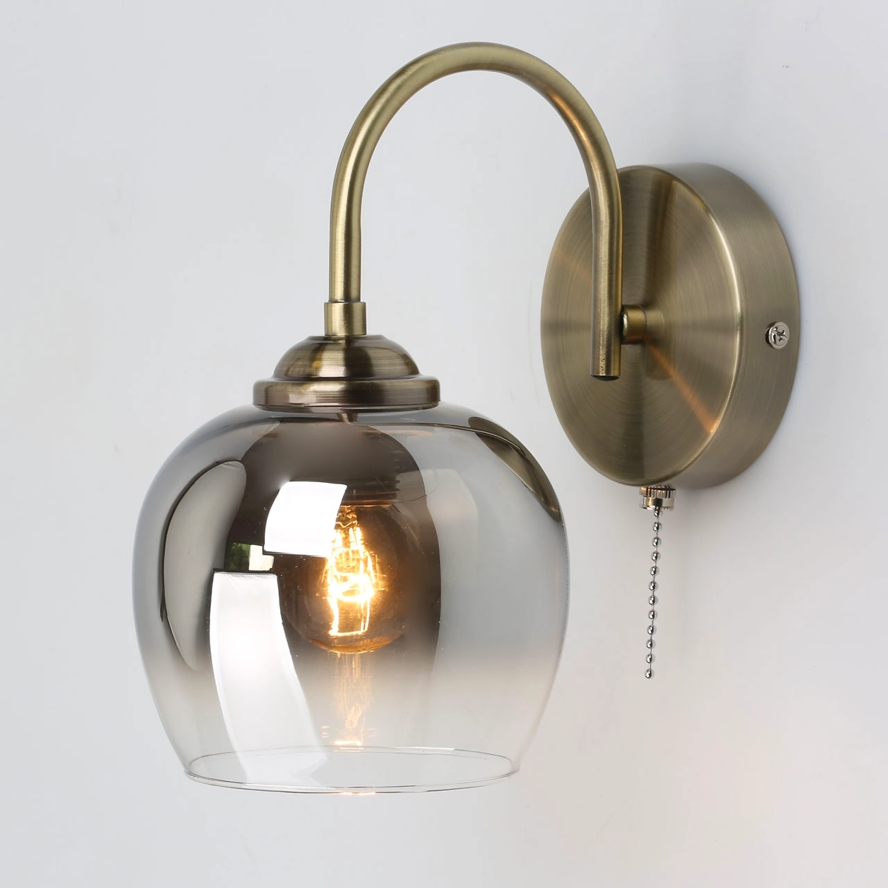 Металлическое основание настенного бра гальванизировано в цвет античной бронзы. Стеклянный плафон выдувается в форму и градиентно гальванизирован в цвет бронзы.