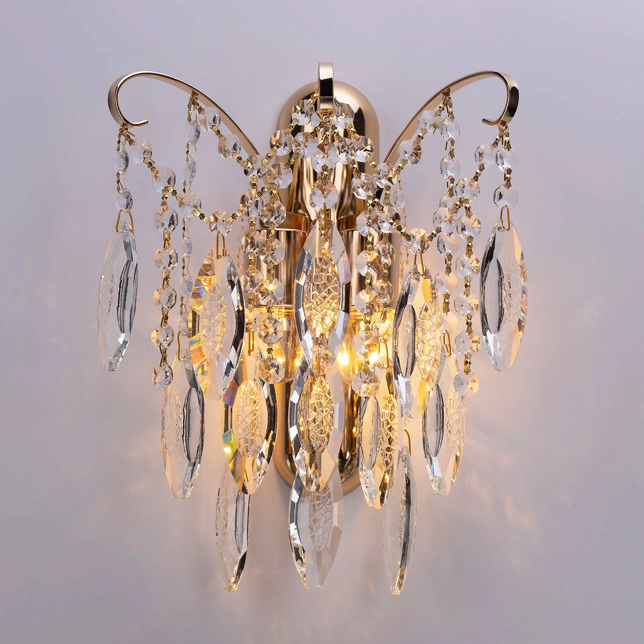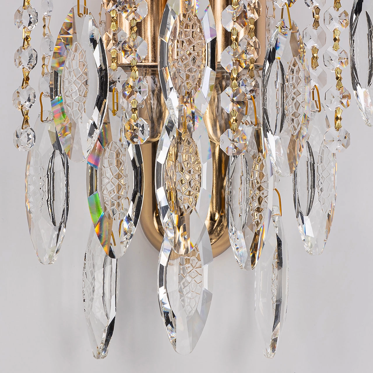 Металлическое основание настенного бра гальванизировано в золотой цвет. Светильник декорирован подвесками из фактурного прозрачного хрусталя в форме октагон и око.