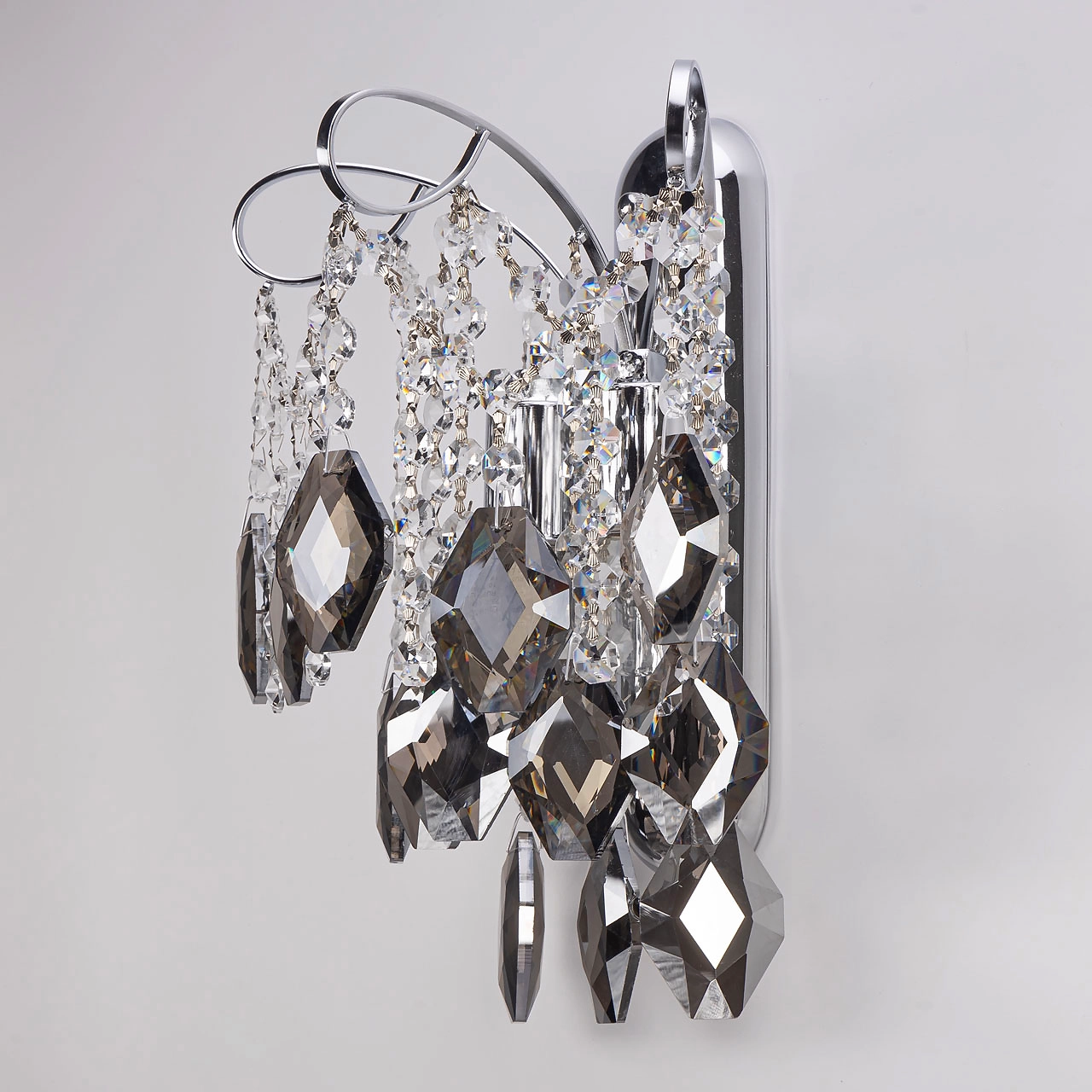 Металлическое основание гальванизировано в цвет хрома. Вертикальное настенное бра декорировано хрусталем формы ромбов, гальванизированным в дымчатый цвет и прозрачным хрусталем в форме октагонов.