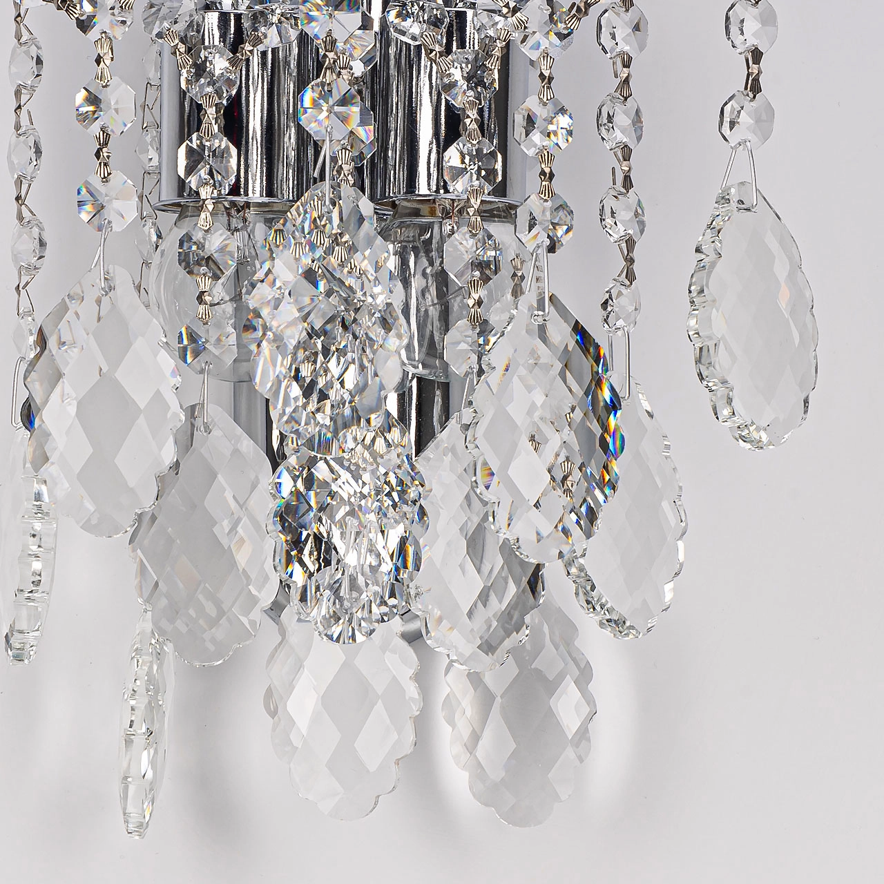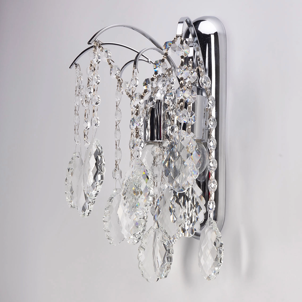 Металлическое основание гальванизировано в цвет хрома. Настенное бра декорировано прозрачным хрусталем в форме резных листьев и октагонов.