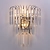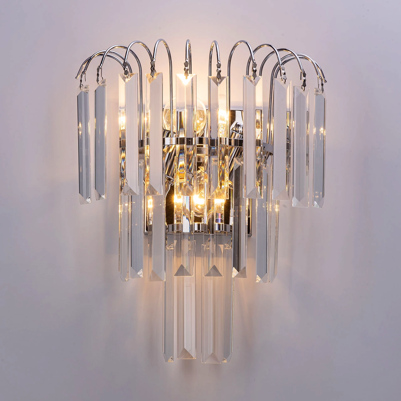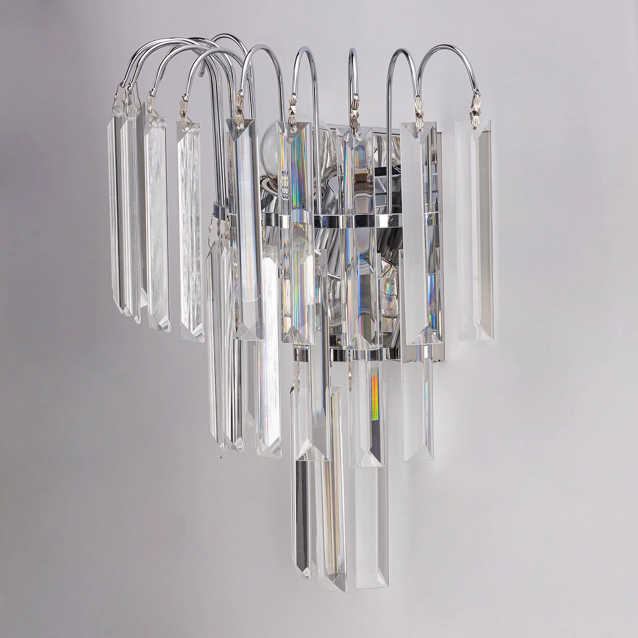 Металлическое основание настенного бра гальванизировано в цвет хрома. Бра декорировано прозрачным хрустальным стеклом вытянутой формы.