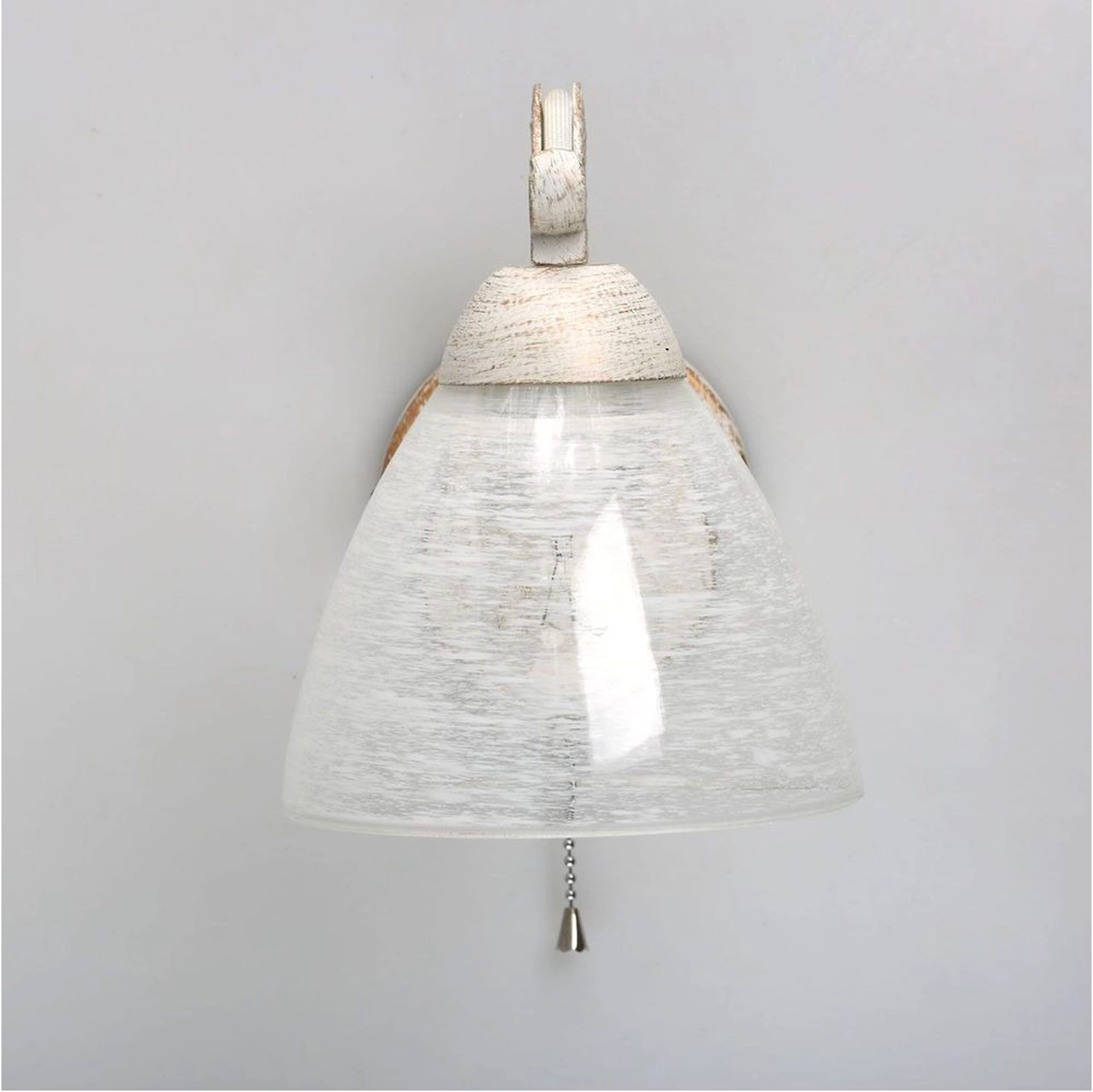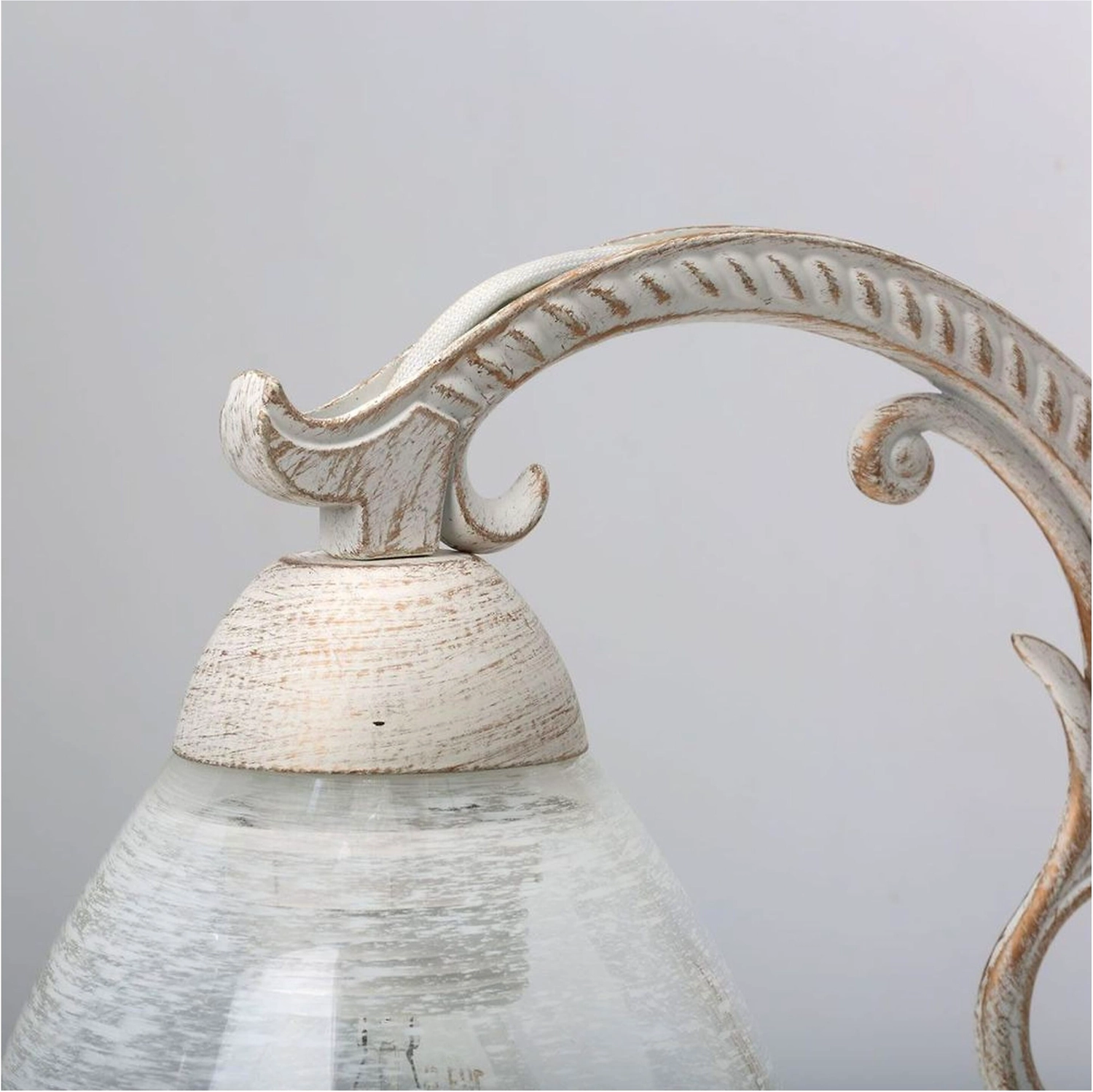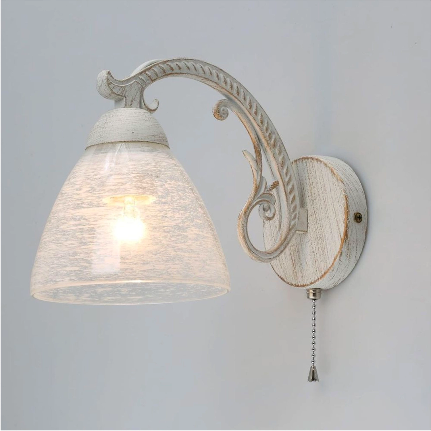 Универсальная модель для зональной подсветки интерьеров различной тематики. Стеклянный плафон с рисунком обеспечивает высокую степень освещенности. Фигурный рожок художественного литья белого цвета, вручную патинирован золотистой краской. Заменяемый источник света удобен в эксплуатации.