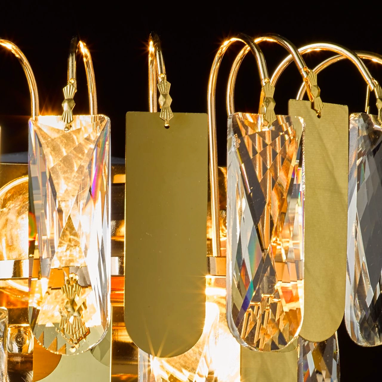 Дизайн-идея в контрасте цветов и фактур поверхностей. Актуальная комбинация декоративных металлических подвесок золотого цвета и хрусталя. Полная семья из бра и люстры на 6 ламп.