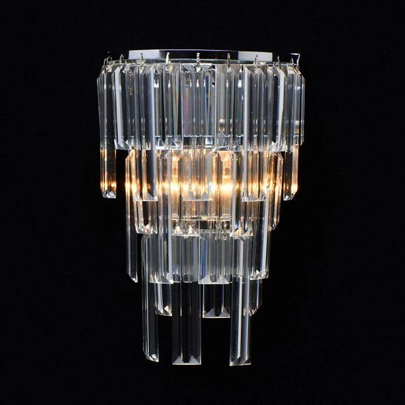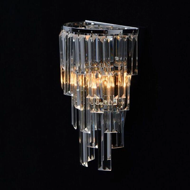 Основание светильника выполнено из металла и гальванизировано в цвет хрома. Светильник декорирован прозрачным хрусталем прямоугольной формы.