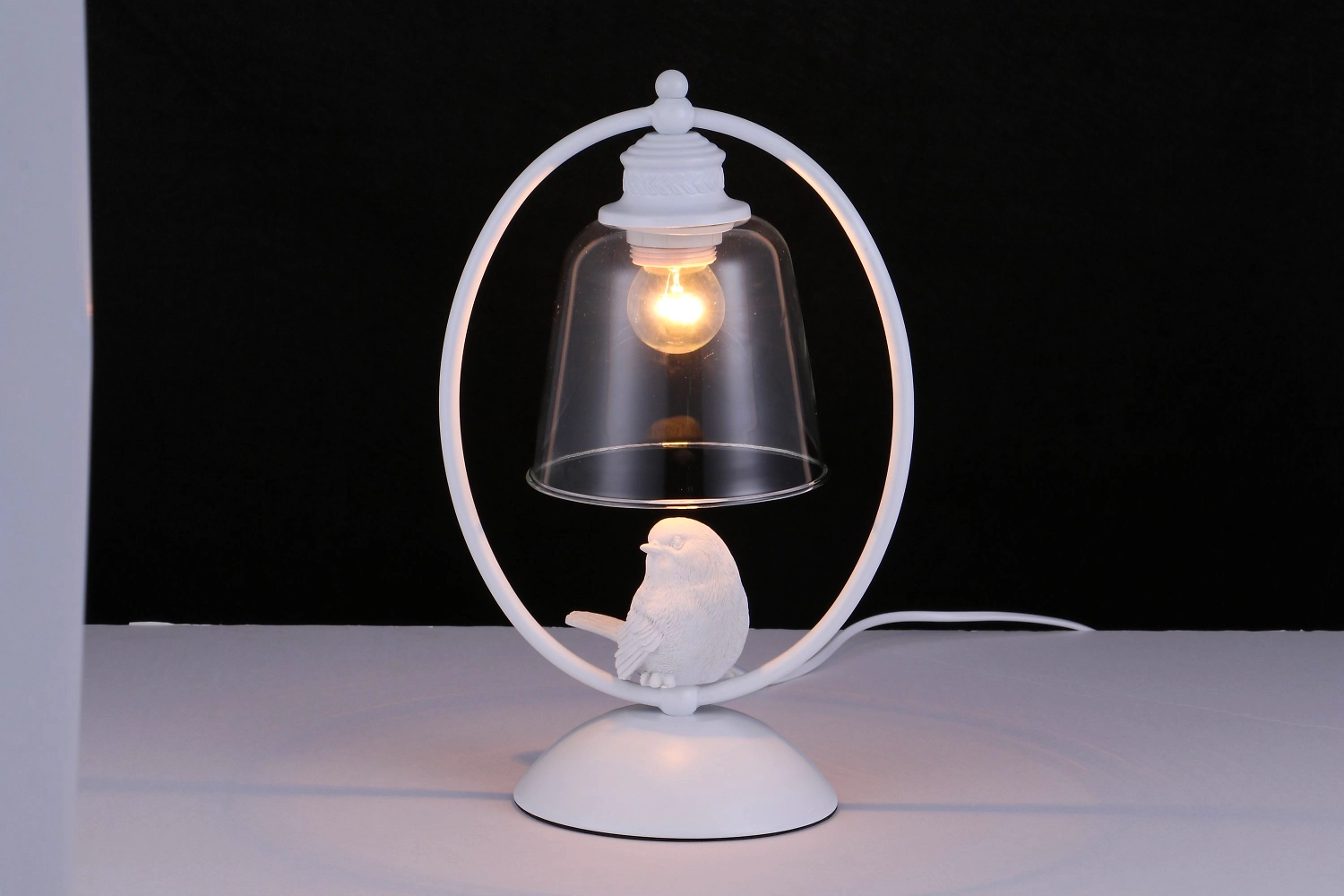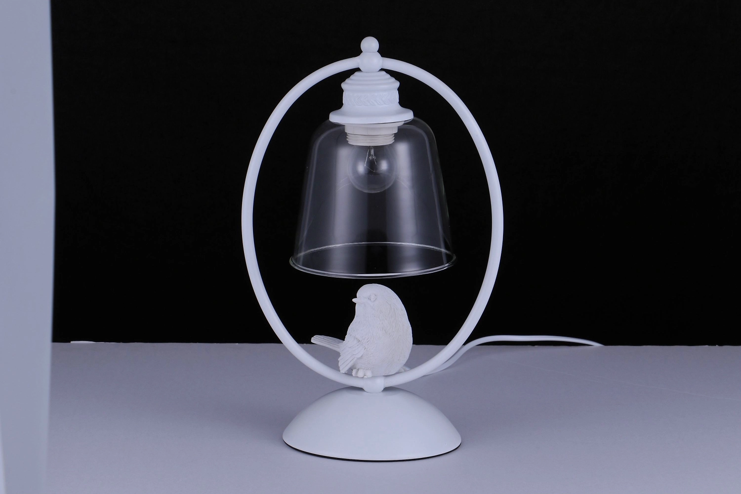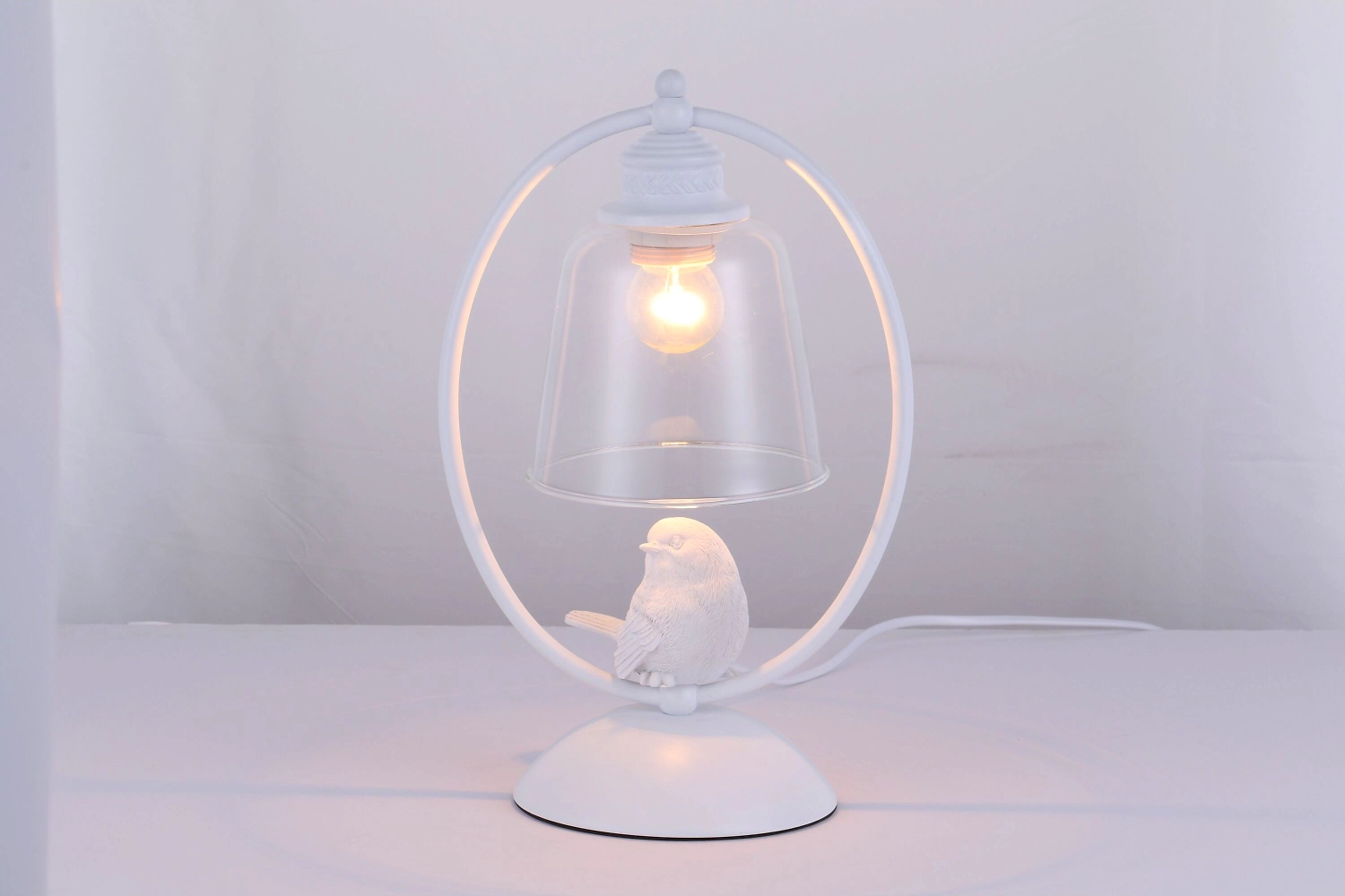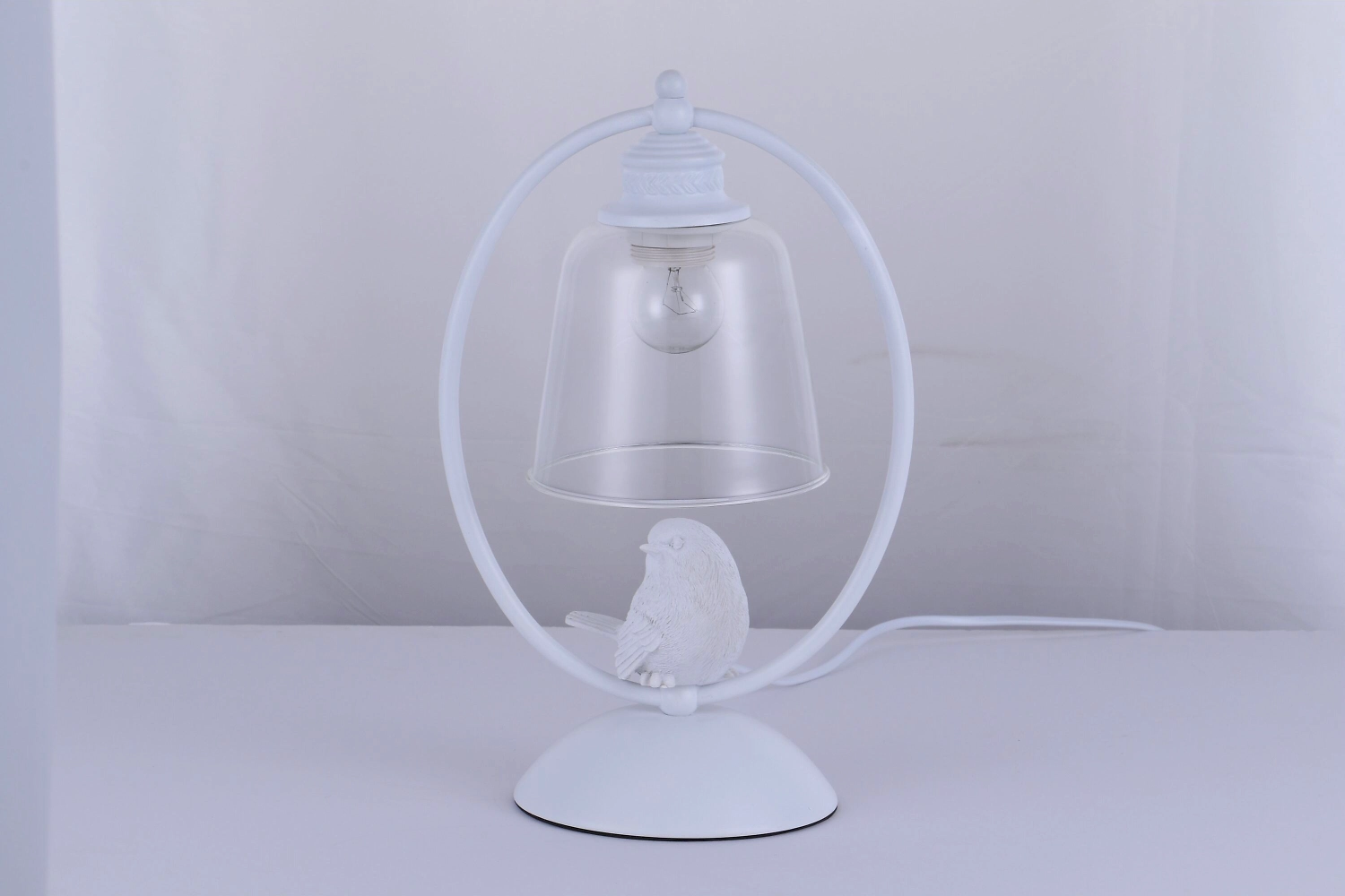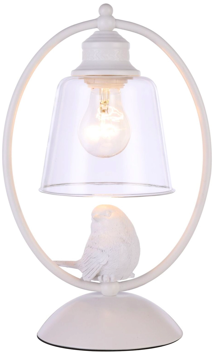 Конструкция выполнена из металла в классическом белом цвете. Плафон изготовлен из прозрачного стекла. Изделие дополнено декором в виде миниатюрной птички. Металлические элементы устойчивы к развитию коррозии и другим неблагоприятным внешним воздействиям. Стеклянный абажур отличается хорошими прочностными характеристикам. От пыли и загрязнений светильник достаточно периодически обрабатывать мягким, слегка влажным материалом.