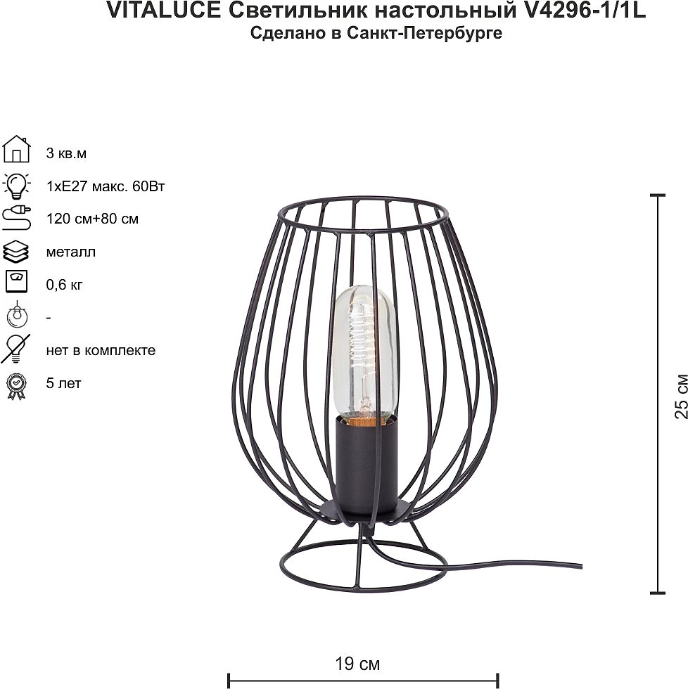 Настольный светильник Vitaluce в черном цвете выполнен в стиле лофт, но может прекрасно дополнить различные по стилю интерьеры. Расчитан на 1 лампу мощностью 60Вт для эффективного освещения 3м² помещений. Имеет тип цоколя - E27. Основание и плафон изделия выполненны из металла.