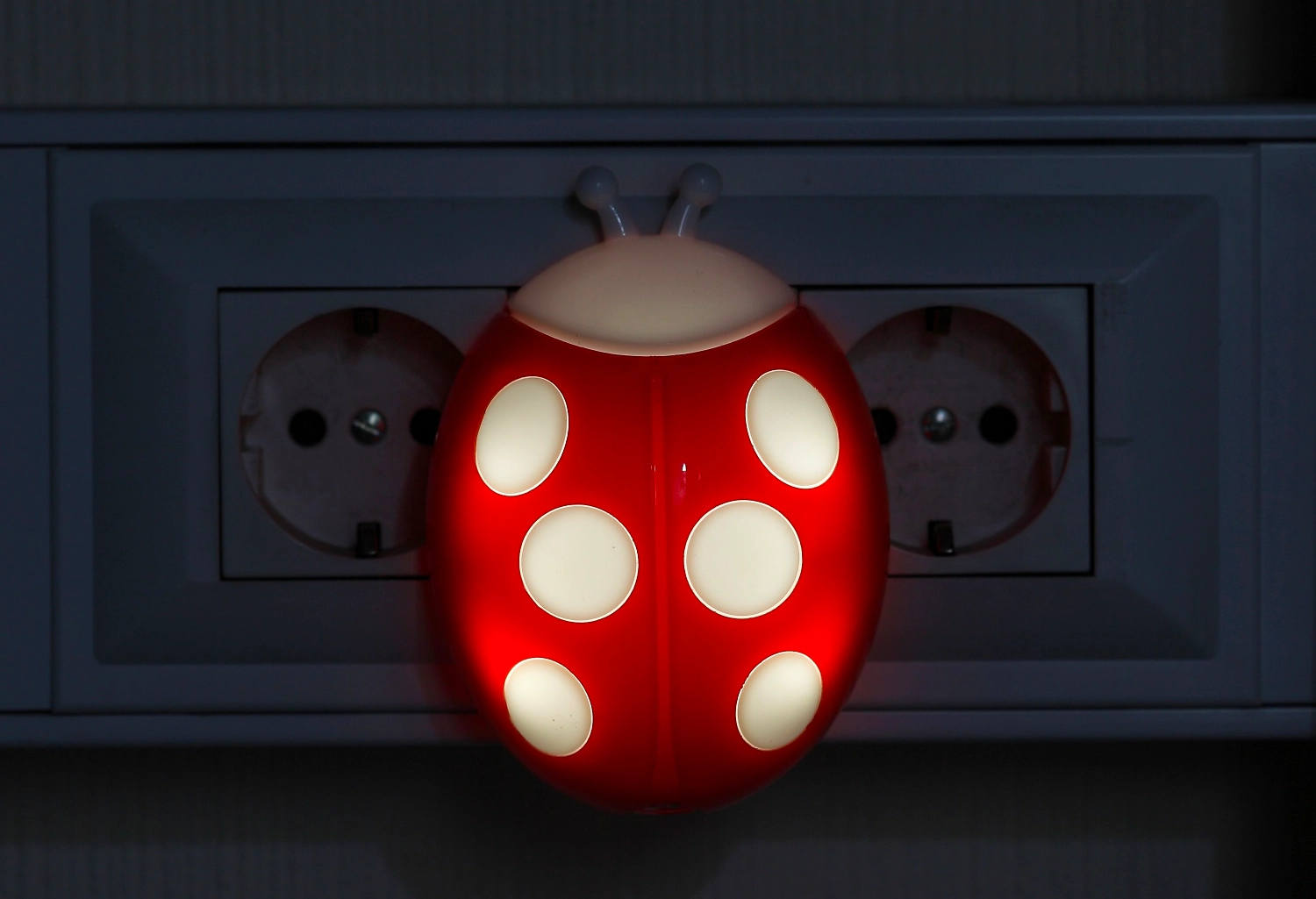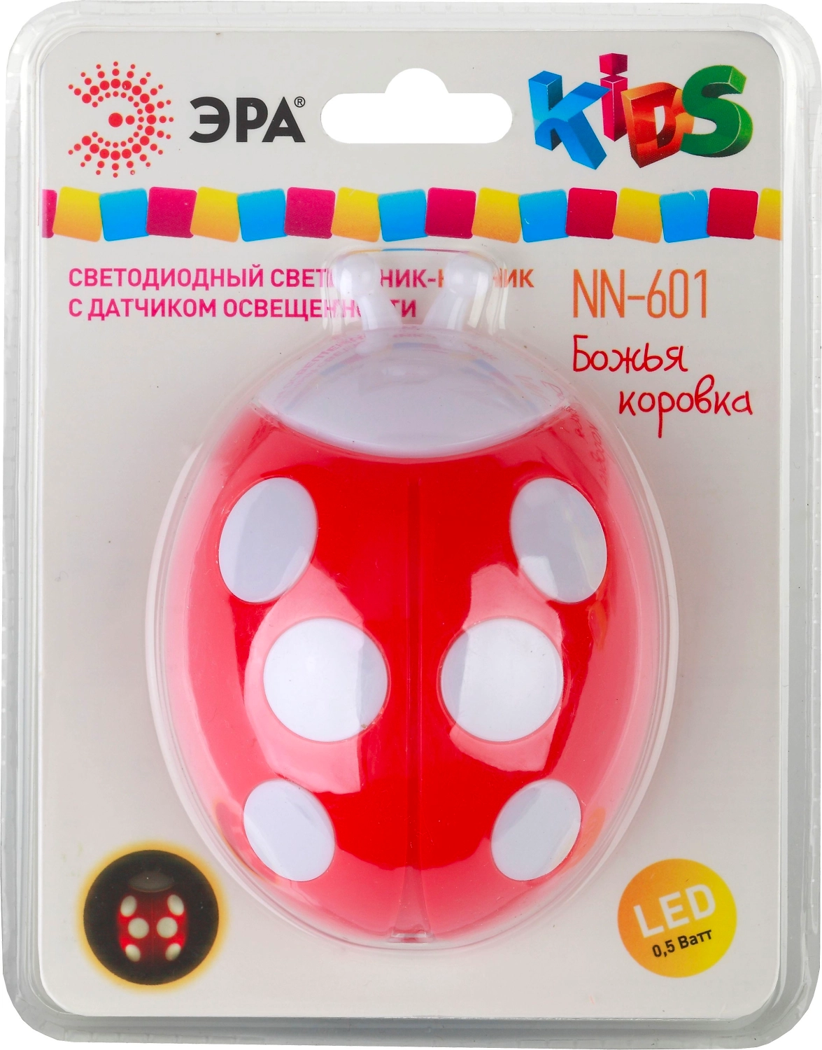 Ночник со светодиодами (LED) в качестве источников света. Имеет съемную бикомпонентную насадку в виде цветной фигурки "Божья коровка".