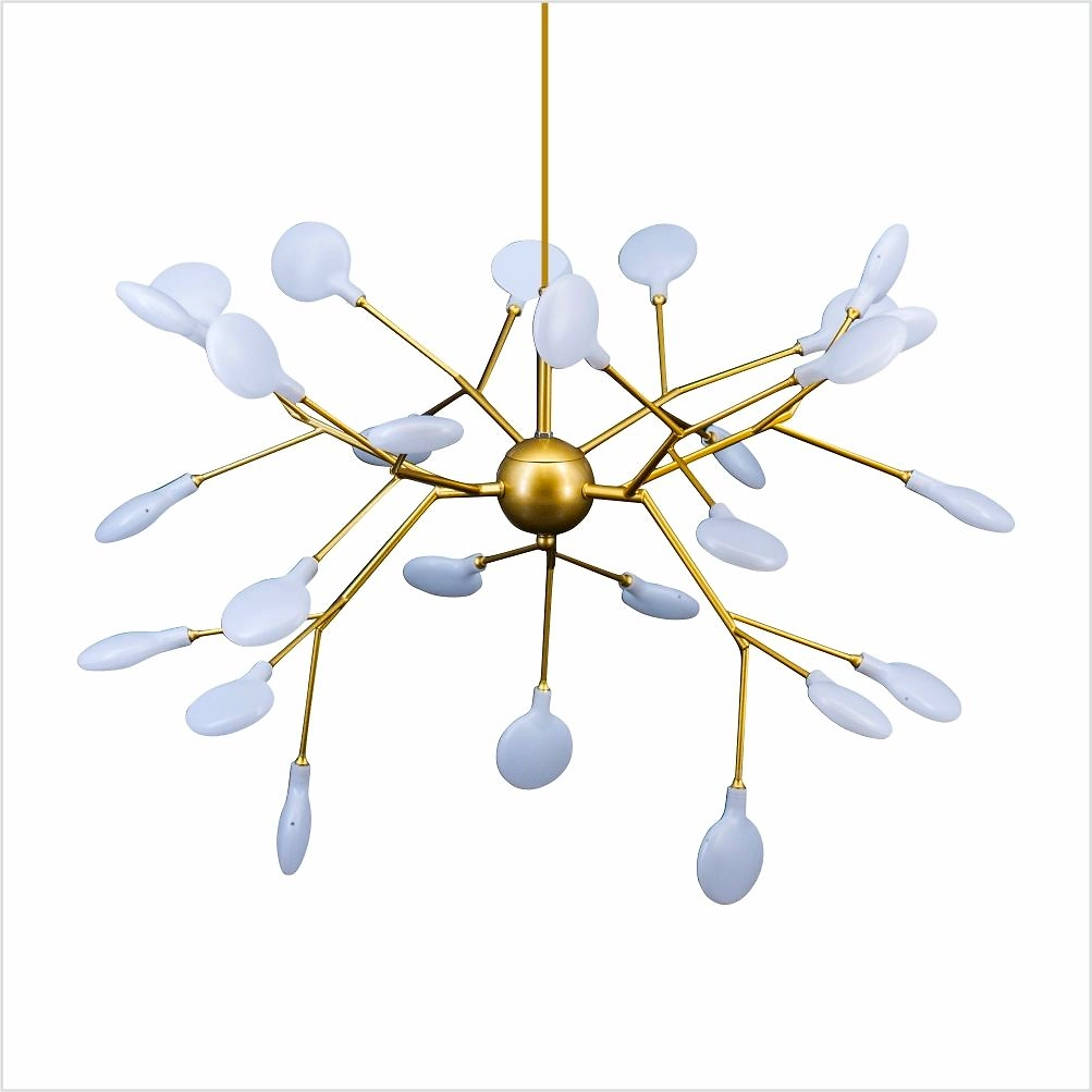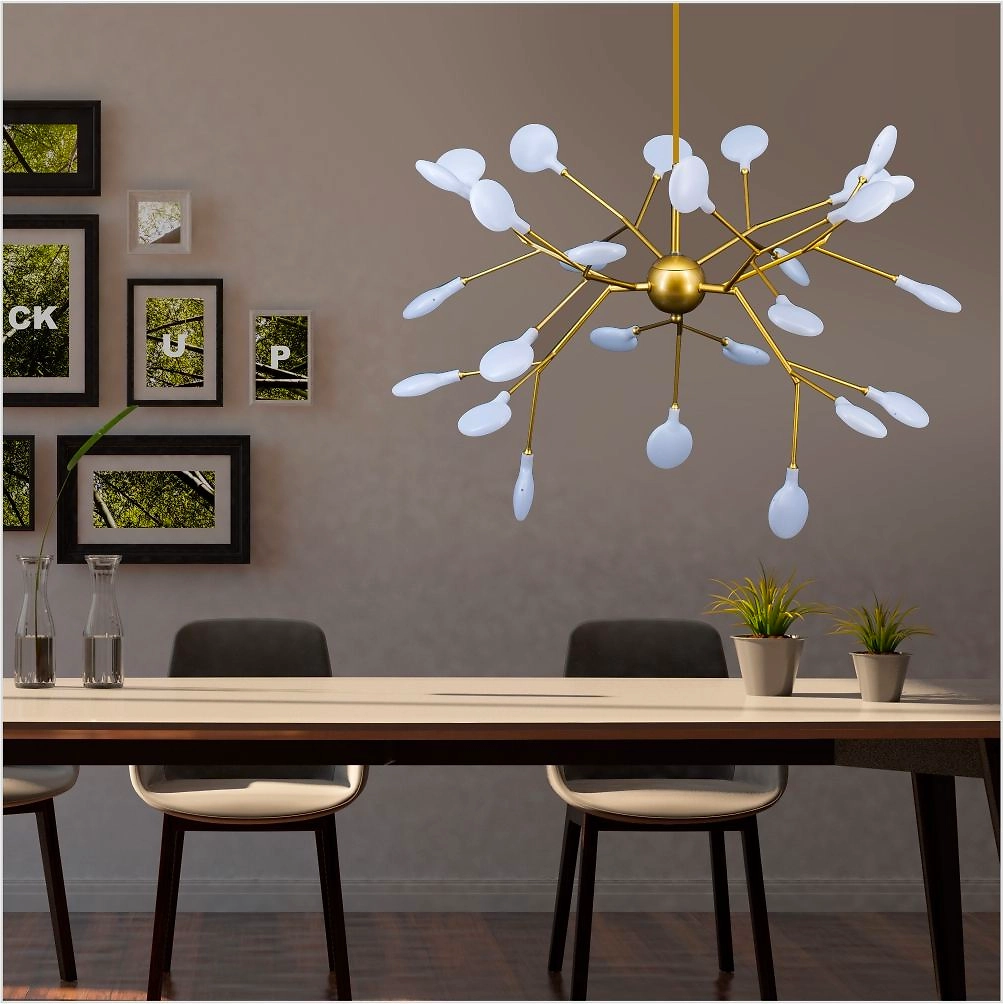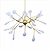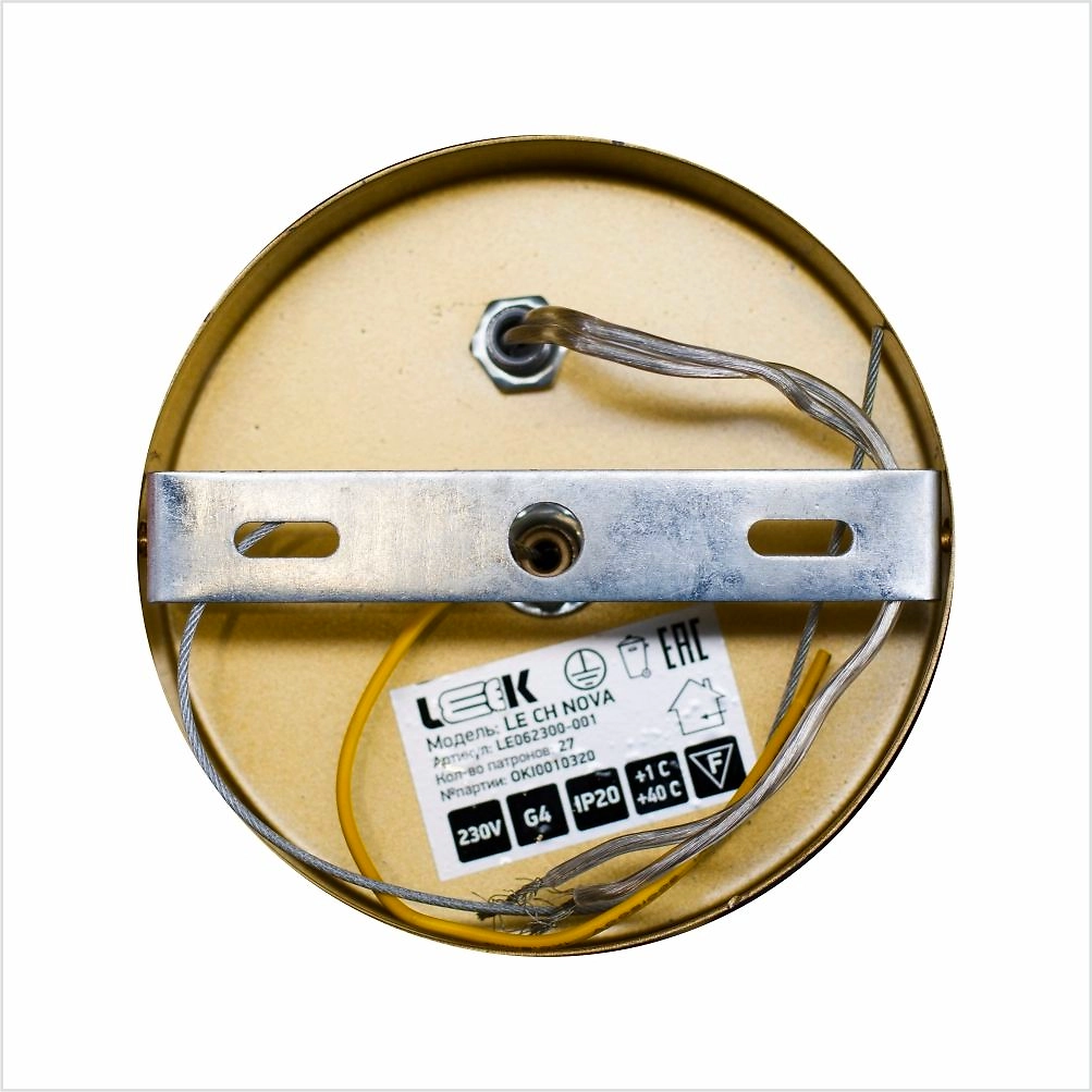 Подвес имеет основание золотого цвета, дополненное белыми матовыми лампочками. Конструкция крепится к потолку при помощи монтажной планки.