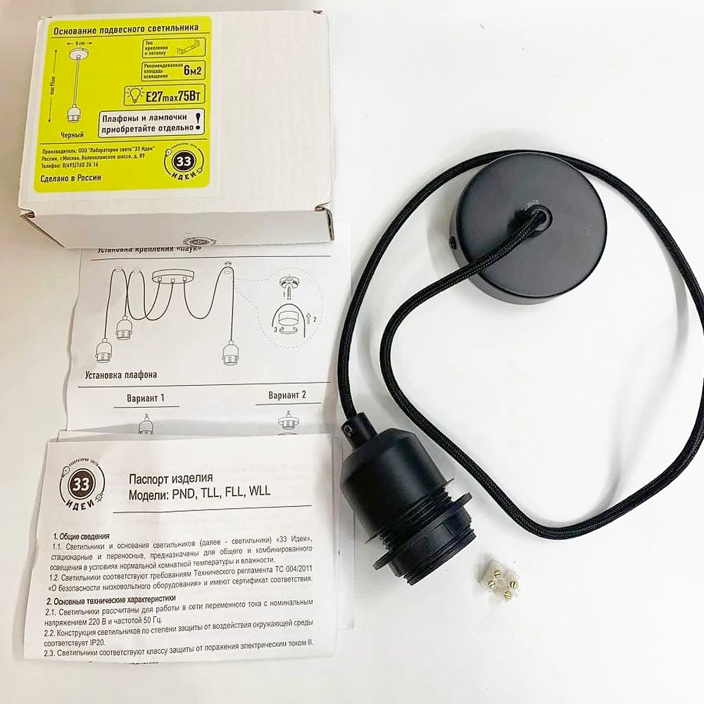 Основание подвесного светильника "33 Идеи" на один плафон, черного цвета с черным тканевым проводом максимальной длины 1 м
