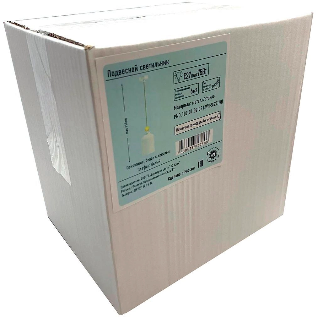 Подвесной светильник на белом основании с одним плафоном. Плафон формы колба выполнен из белого матового стекла.