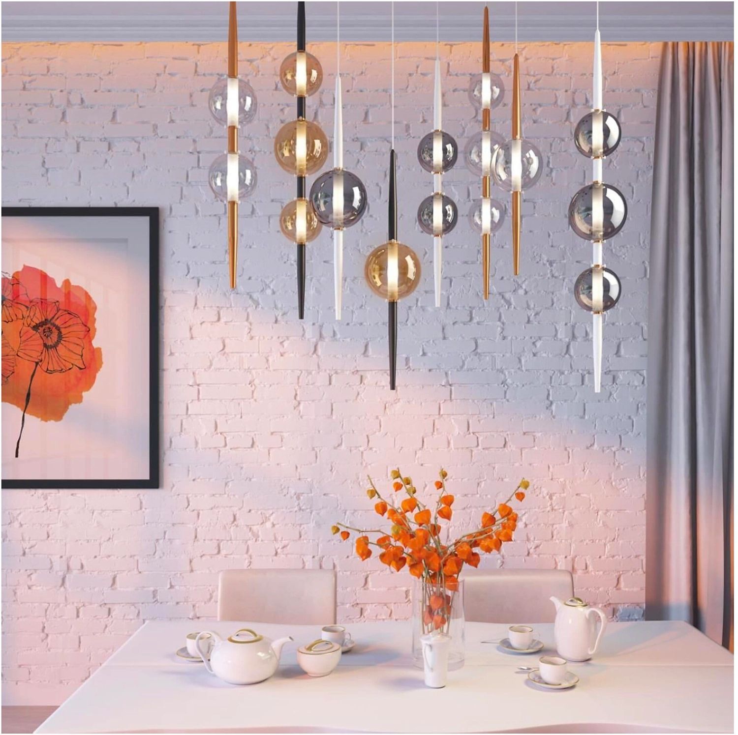 Lazia очень трендовая серия оригинальных подвесов в трех цветовых комбинациях металлического основания и стеклянных шаров: белый/дымчатый, черный/янтарный, медный/прозрачный.