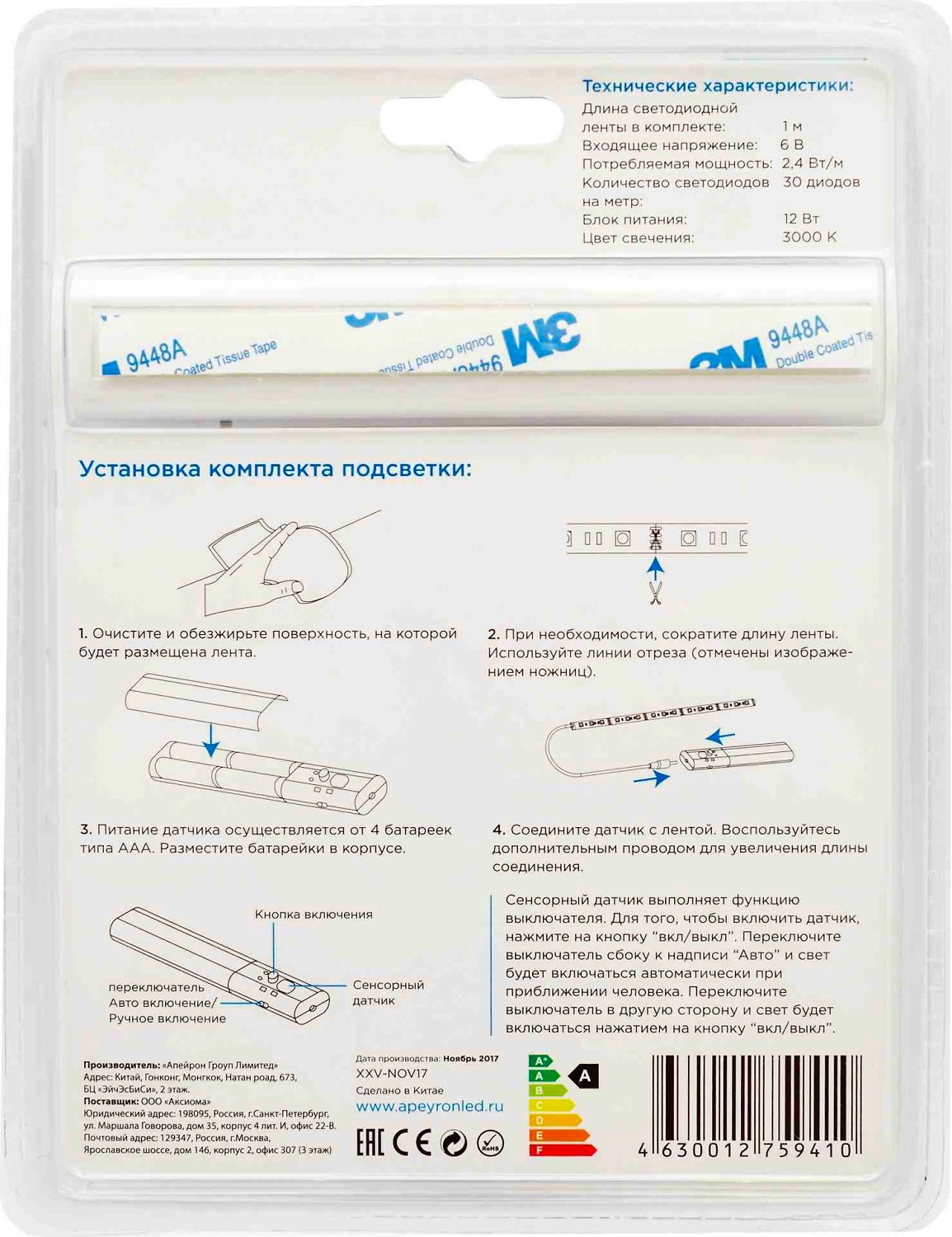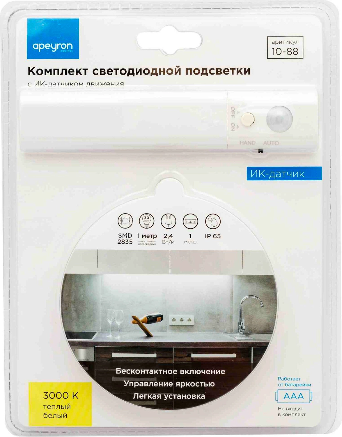 В состав готового комплекта для интерьерной подсветки с артикулом с артикулом 10-88 входит 1 метр светодиодной ленты, которая работает от постоянного тока с напряжением 6В. Благодаря светодиодам smd 2835 излучающим световой поток равный 140 Лм/м лента является прекрасным решением для воплощения в жизнь такого элемента декора, как декоративная подсветка даже там, где нет возможности провести электричество. По сравнению с лампами накаливания светодиодная лента эквивалентна лампам мощностью 20 Вт. Данная модель светодиодной ленты обладает теплым белым цветом свечения с цветовой температурой 3000 К. Источником питания данной подсветки служит блок питания работающий от 4-х батареек стандарта ААА. На самом блоке питания размещен инфракрасный датчик режима и выключатель с возможностью выбора автоматического режима включения подсветки при движении. Степень защиты светодиодной ленты соответствует стандарту IP20, что подразумевает использование только в сухих и проветриваемых помещениях. Отрезать светодиодную ленту можно в специально отмеченных местах, которые располагаются через каждые 33 мм. Компактные размеры светодиодной ленты с шириной 8 мм и основанием из гибкой, двухслойной, медной подложки дают огромное преимущество при создании любых дизайнерских фантазий.