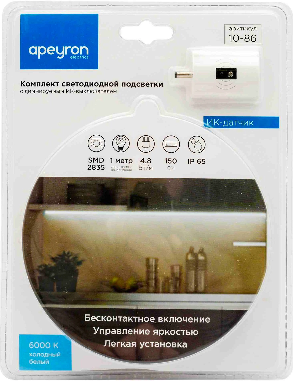В состав готового комплекта с артикулом с артикулом 10-86 входит 1,5 метра светодиодной ленты, которая работает от постоянного тока с напряжением 12В.