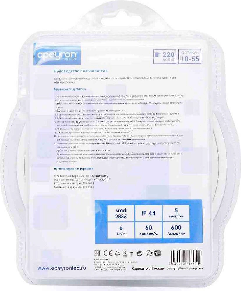 В состав готового комплекта с артикулом 10-55 входит 5 метров светодиодной ленты, которая работает от постоянного тока с напряжением 220В.