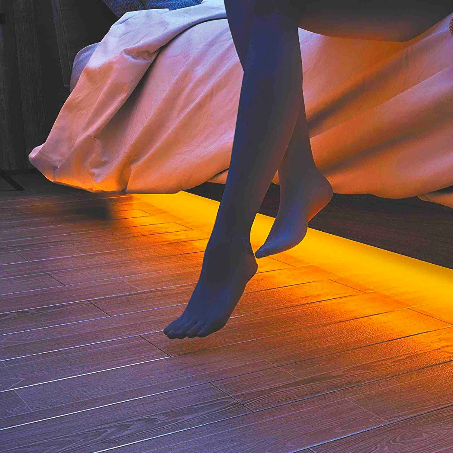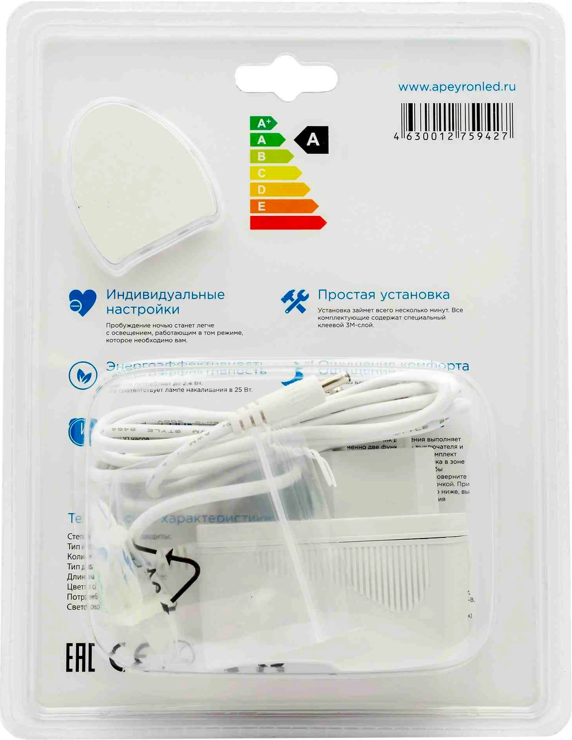 В состав готового комплекта для подкроватной подсветки с артикулом с артикулом 10-89 входит 1,2 метра светодиодной ленты, которая работает от постоянного тока с напряжением 12В. Благодаря светодиодам smd 2835 излучающим световой поток равный 140 Лм/м лента является прекрасным решением для воплощения в жизнь такого элемента декора, как прикроватная подсветка, которая благодаря мягкому свету и датчикам сама создаст комфортную обстановку, если вдруг нужно встать ночью. По сравнению с лампами накаливания светодиодная лента эквивалентна лампам мощностью 20 Вт. Данная модель светодиодной ленты обладает теплым белым цветом свечения с цветовой температурой 3000 К. Также в состав комплекта входит адаптер питания с вилкой в розетку на корпусе, проводом с выключателем и коннектором стандарта 5,5х2,5 для подключения светодиодной ленты, с другой стороны. Степень защиты такого адаптера соответствует стандарту IP44 и допускает установку во влажных местах, но в то же время должна сохраниться защита от прямого попадания воды. Степень защиты светодиодной ленты соответствует стандарту IP65, что позволяет использование не только во влажных помещениях, но и на улице.