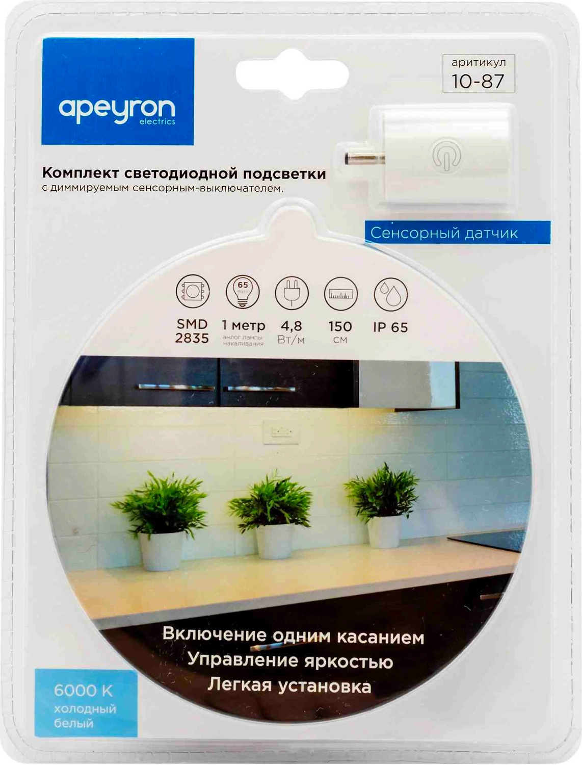 Данная модель светодиодной ленты обладает холодным белым цветом свечения с цветовой температурой 6400 К. Также в состав комплекта входит адаптер питания с вилкой в розетку на корпусе, проводом с выключателем и коннектором стандарта 5,5х2,5 для подключения светодиодной ленты, с другой стороны. Степень защиты такого адаптера соответствует стандарту IP44 и допускает установку во влажных местах, но в то же время должна сохраниться защита от прямого попадания воды. Степень защиты светодиодной ленты соответствует стандарту IP20, что подразумевает использование только в сухих и проветриваемых помещениях. Отрезать светодиодную ленту можно в специально отмеченных местах, которые располагаются через каждые 50 мм. Компактные размеры светодиодной ленты с шириной 8 мм и основанием из гибкой, двухслойной, медной подложки дают огромное преимущество при создании любых дизайнерских фантазий. В дополнение к вышеупомянутой информации добавим, что данный комплект уже содержит в своем составе сенсорный выключатель с функцией диммирования. Коснитесь выключателя для того, чтобы включить и выключить ленту или задержите касание, чтобы яркость уменьшилась или увеличилась.