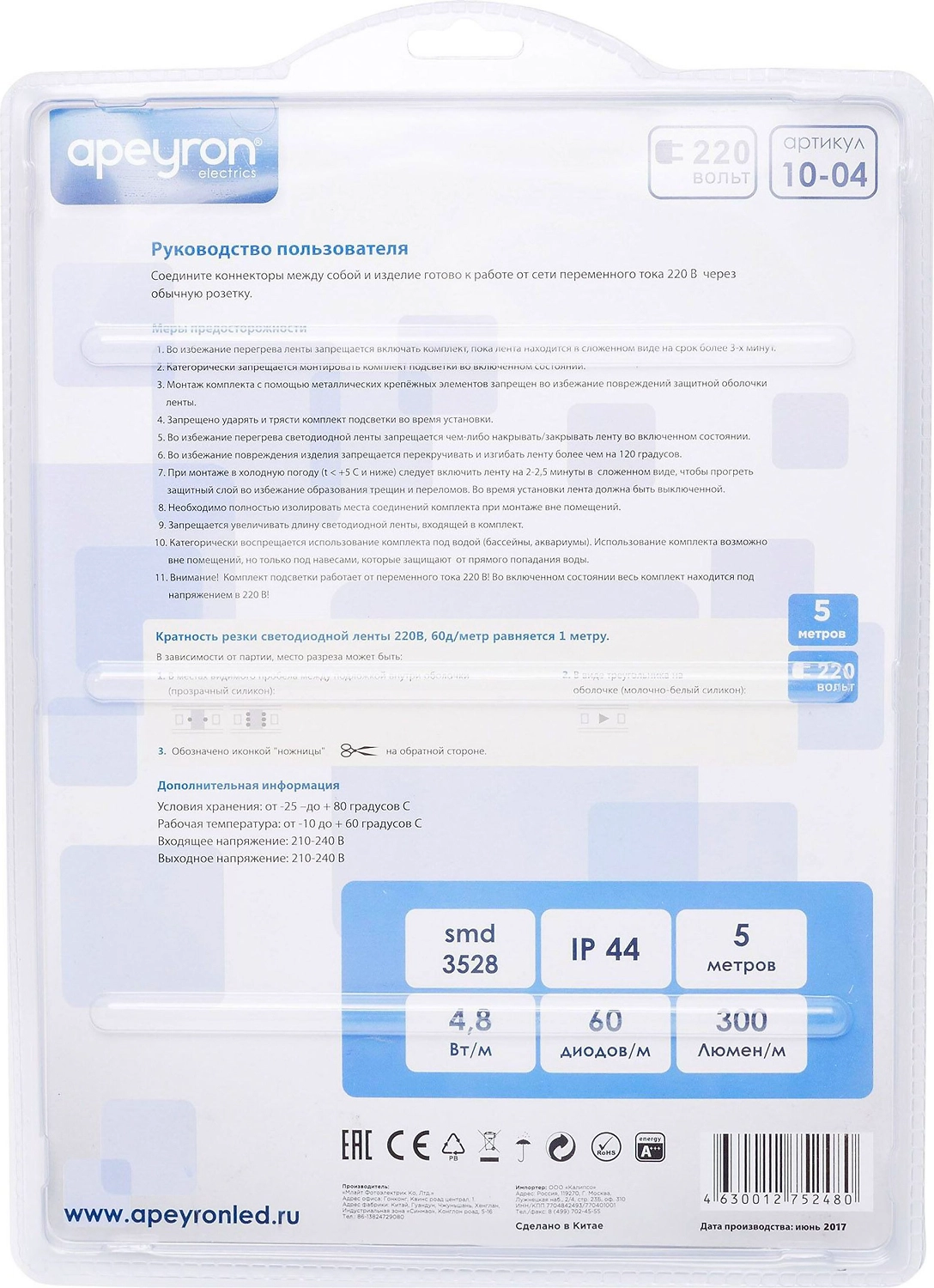 Светодиодная лента Apeyron Electrics SMD 3528 60LED IP44 220В 4,8Вт 5 м