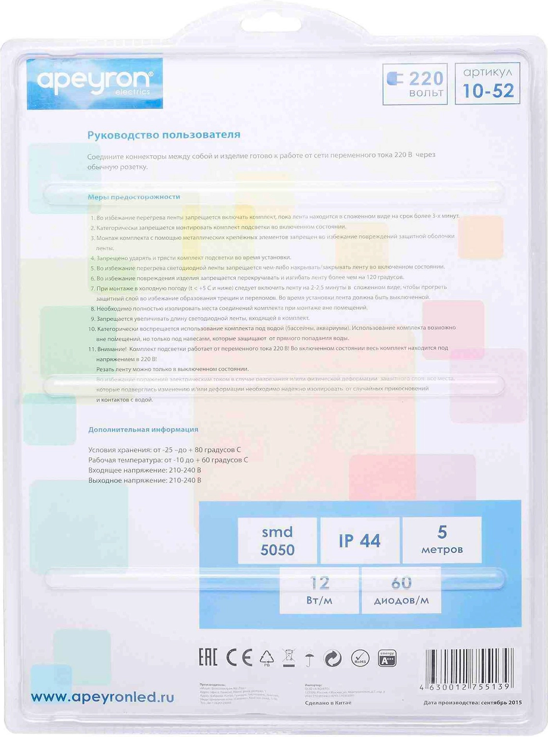 В состав готового комплекта с артикулом с артикулом 10-52 входит 5 метров светодиодной ленты, которая работает от постоянного тока с напряжением 220В. Благодаря светодиодам smd 5050 излучающим световой поток равный 600 Лм/м лента является прекрасным решением для воплощения в жизнь такого элемента декора, как декоративная подсветка в нежилых помещениях, беседках и уличных конструкциях. Она подойдет для декорирования ниш в стенах, многоуровневых потолков и даже мебели. По сравнению с лампами накаливания светодиодная лента эквивалентна лампам мощностью 60 Вт. Данная модель светодиодной ленты является многоцветной. Каждый светодиод такой ленты имеет 3 базовых цвета: синий, зеленый и красный. В зависимости от используемого контроллера можно получить до 256 различных оттенков свечения.