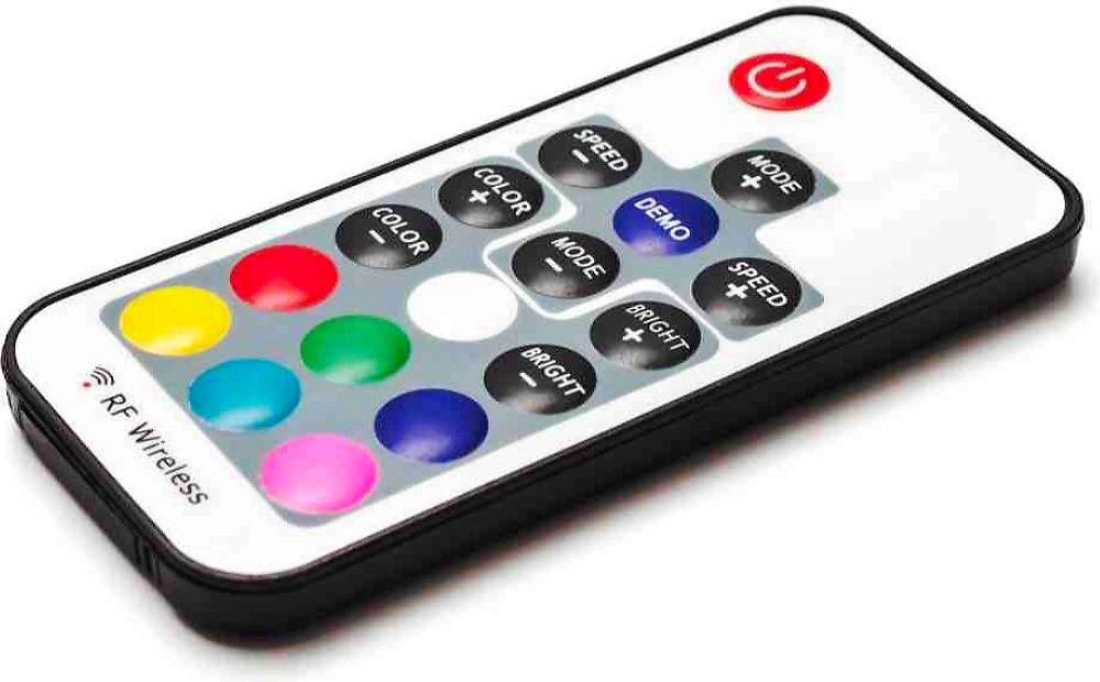 Степень защиты светодиодной ленты соответствует стандарту IP20, что подразумевает использование только в сухих и проветриваемых помещениях. Отрезать светодиодную ленту можно в специально отмеченных местах, которые располагаются через каждые 33 мм. Компактные размеры светодиодной ленты с шириной 10 мм и основанием из гибкой, двухслойной, медной подложки дают огромное преимущество при создании любых дизайнерских фантазий. В дополнение к вышеупомянутой информации добавим, что данный комплект уже содержит в своем составе RGB контроллер с пультом передающим сигнал по радиоканалу, который работает на дистанции до 15 метров без надобности находиться в зоне прямой видимости.