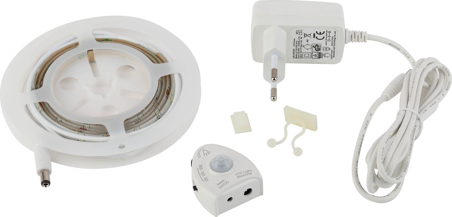 Комплект одноцветной светодиодной ленты с датчиком движения. 12 В, 4,8 Вт/м, цветовая температура 2700 К. Длина ленты 1,2 м. Тип светодиода 2835, 30 LED/м.