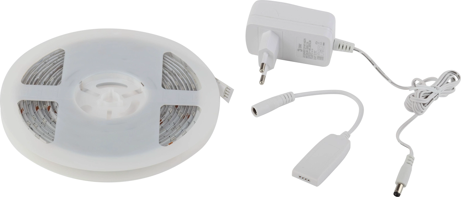 Комплект многоцветной (RGB) светодиодной ленты 12 В, максимальная мощность 7,2 Вт/м, влагозащищенность IP65. Длина ленты 5 метров. Тип светодиода 5050, 30 LED/м. В составе комплекта: LED лента на двустороннем скотче, источник питания, Wifi-контроллер. Управление лентой осуществляется через смартфон с помощью приложения. Регулировка яркости свечения от 1 до 100 процентов. 16 млн. комбинаций цвета и яркости. Готовое решение для внутреннего освещения, подсветки ниш, лестничного пространства, систем хранения, декоративного и художественного оформления.
