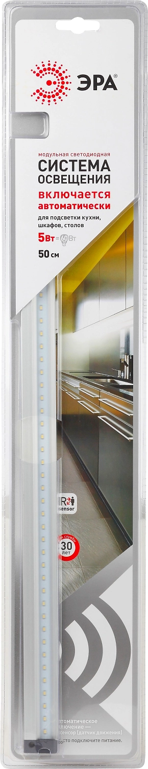Модульная система на светодиодах ЭРА - готовое решение для дополнительного освещения рабочих поверхностей кухни, письменных столов, шкафов и других зон в помещении. Данная модель снабжена датчиком движения, который реагирует на движения руки в зоне датчика на расстоянии до 5 см от него, либо включается при открывании/закрывании ящиков.