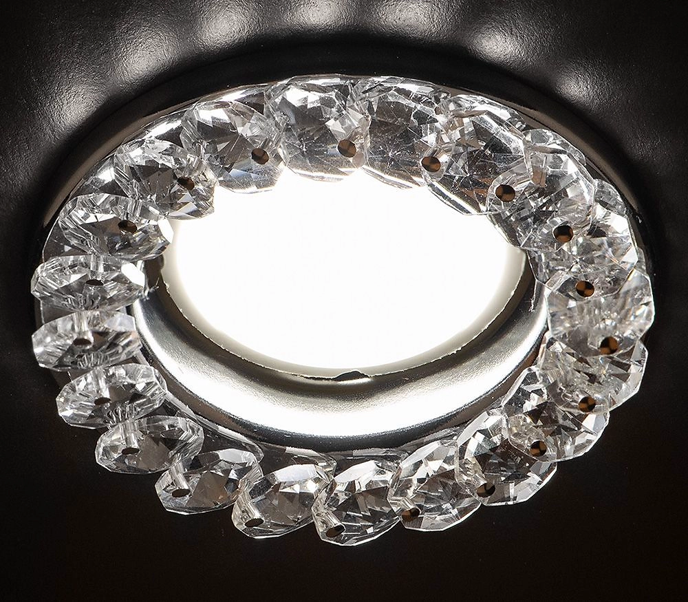 Светильник круглой формы декорирован крупными хрустальными стразами, красиво преломляющими свет. Они добавляют модели очарования и выразительности. Такой светильник может использоваться для дополнительного освещения просторной комнаты, лестниц, шкафов-витрин и кухонной мебели. В данной модели используются светодиодные лампы или галогенные, с подходящим цоколем.