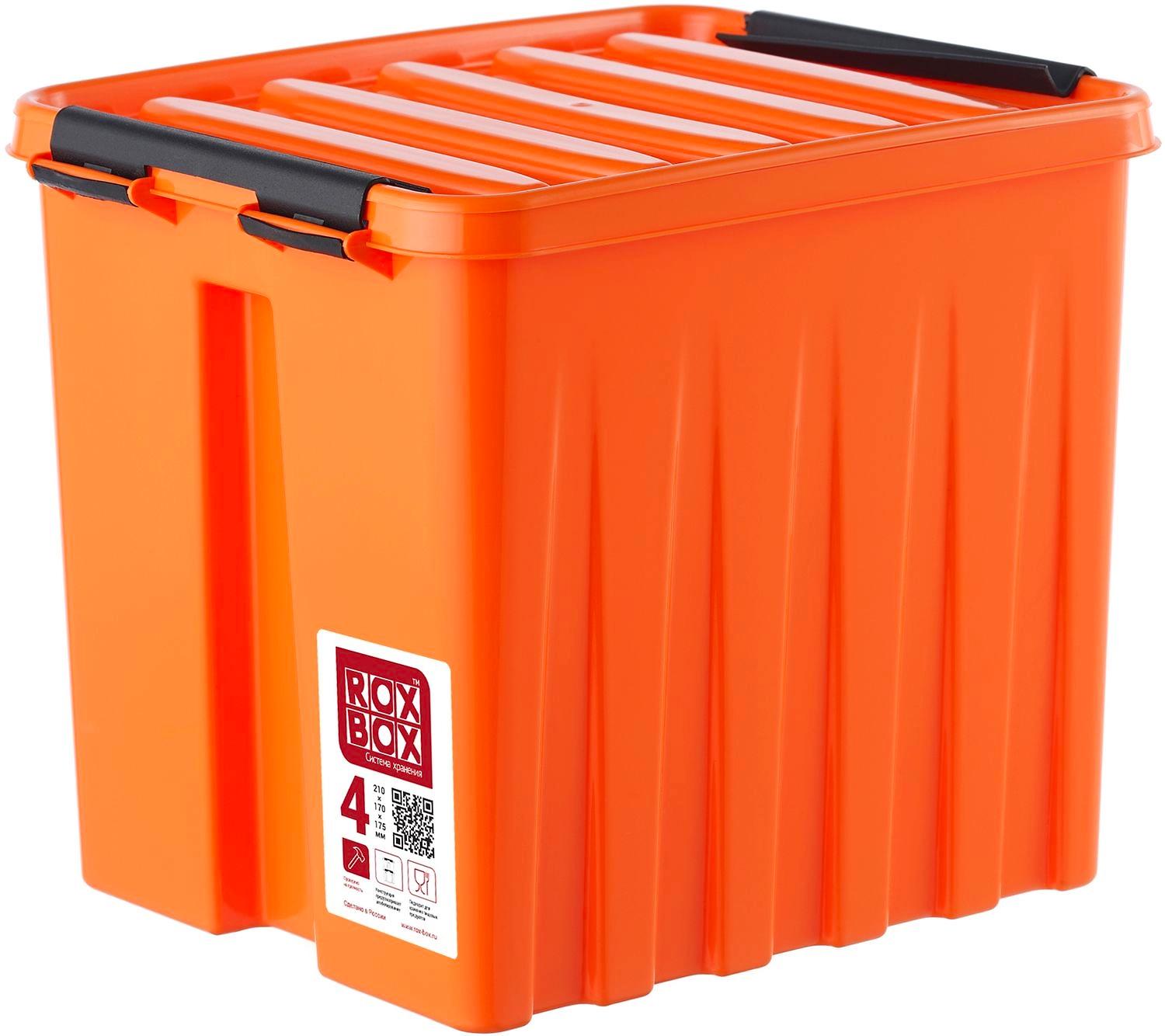 Контейнер ROXBOX объемом 4,5 л из полипропилена оснащен крышкой на защелках. Непрозрачный корпус оранжевого цвета позволяет хранить предметы, чувствительные к ультрафиолетовому излучению. Содержимое герметичного ящика защищено от пыли и влаги.