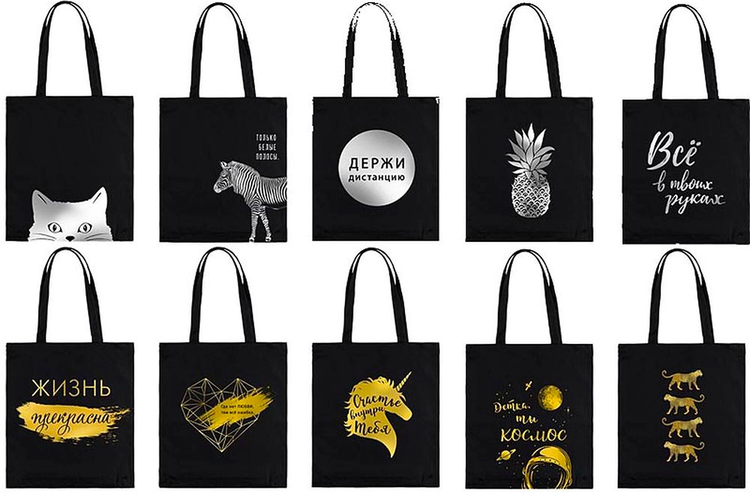 Черный цвет с благородным золотом и эффектным серебром - то что нужно для наступающего сезона. Прибавьте к этому яркие трендовые принты и материал натурального происхождения (100% хлопок) и вы получите наш новый продукт-экосумку. Это идеальное решение для повседневного использования, поскольку сумка не только вместительная, но и подойдет к любому гардеробу. Ее удобно складывать и брать с собой, а при необходимости можно легко стирать.