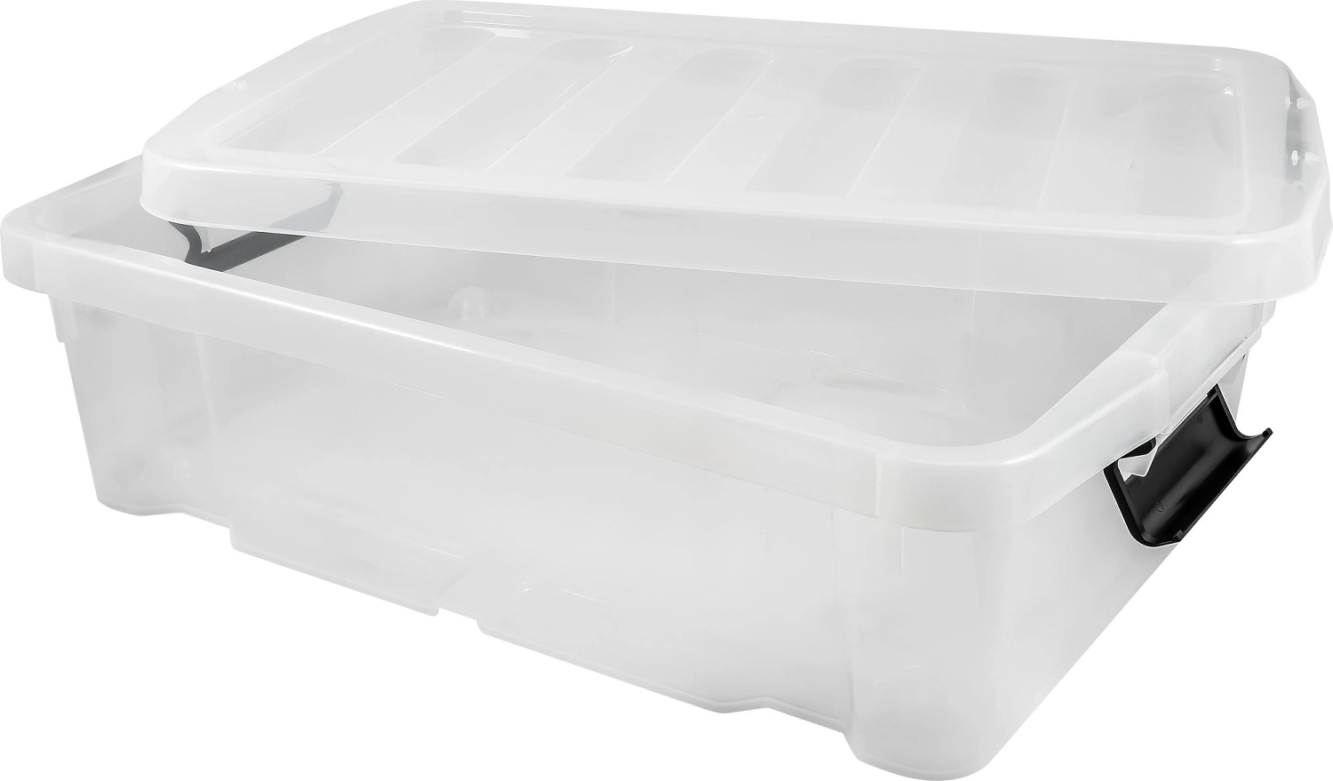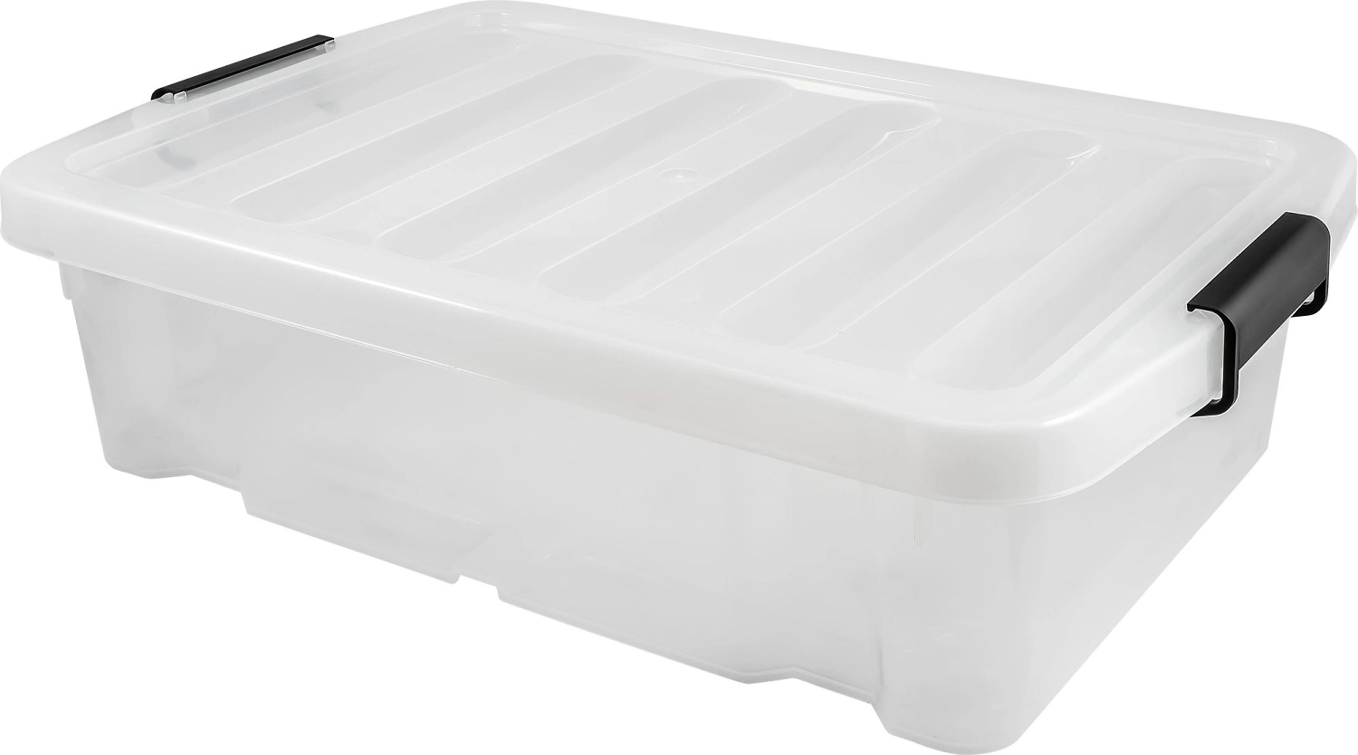 Прочный и надежный ящик для хранения PREMIUM 30л с боковыми замками-фиксаторами поможет организовать хранение в квартире и на даче, а также для перевозки вещей при переезде. Благодаря плоской форме легко помещается под кровать. Прозрачный корпус и крышка позволяют видеть содержимое, что удобно для хранения в закрытых гардеробных. В месте крепления ручек предусмотрены выемки для удобного захвата ящика рукой при переноске и снятия с полки. Конструкция корпуса и крышки позволяет штабелировать ящики друг в друга. Безопасный пластик, подходит для контакта с пищей и детскими вещами. Температурный режим: -5 +70°С. Размеры (ДхШхВ): 58х39,5х16см