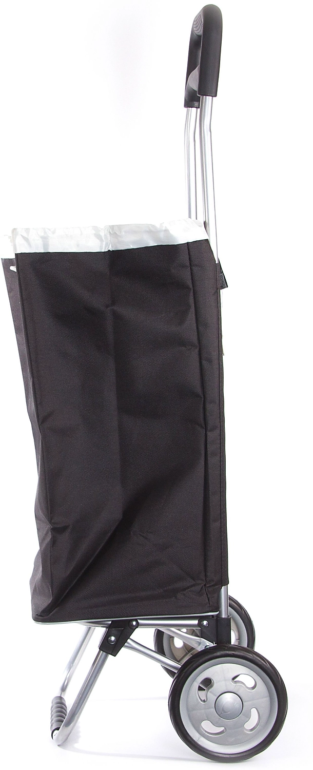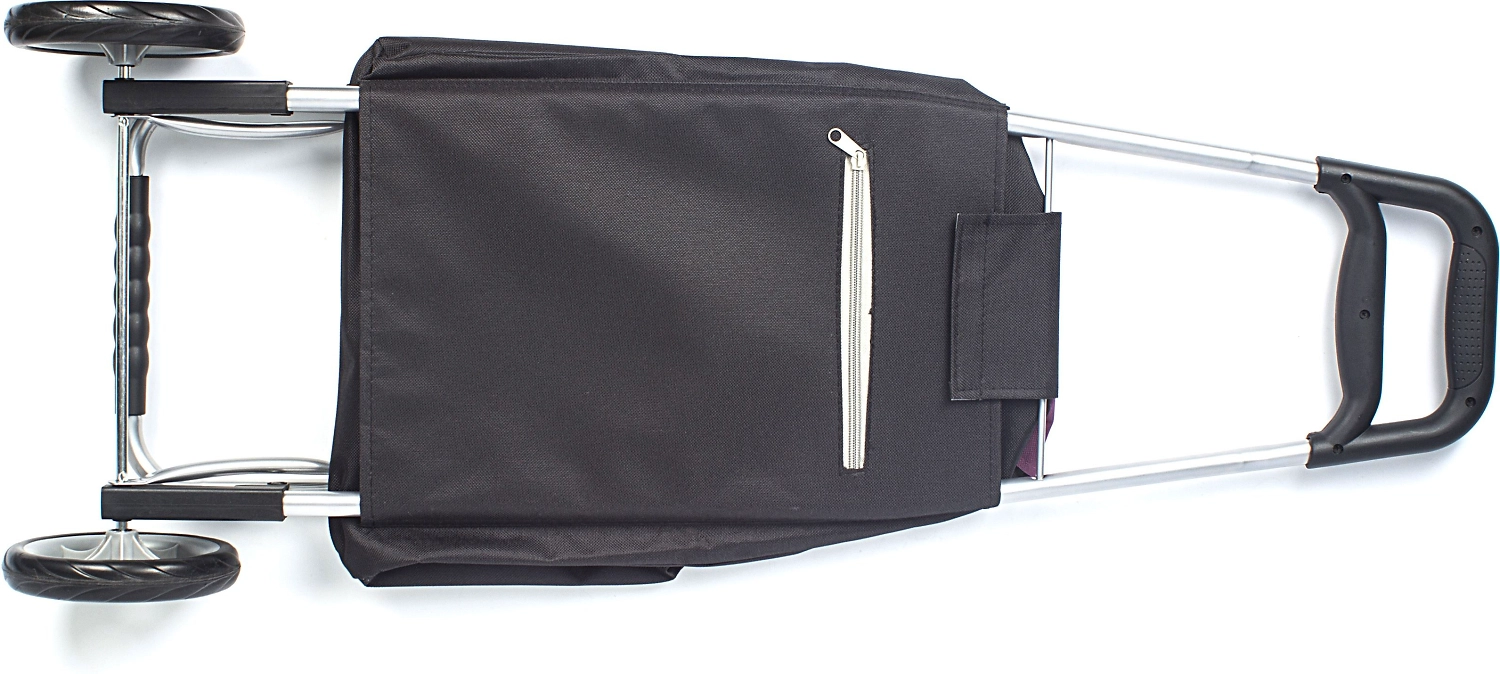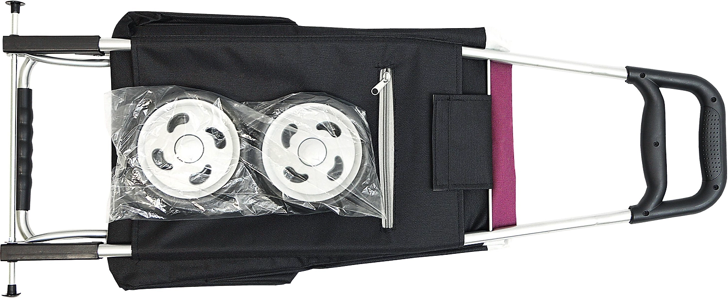 Хозяйственная сумка-тележка изготовлена из полиэстера со стальным каркасом, не позволяющим сумке сминаться или растягиваться. Для перемещения есть два широких колеса.