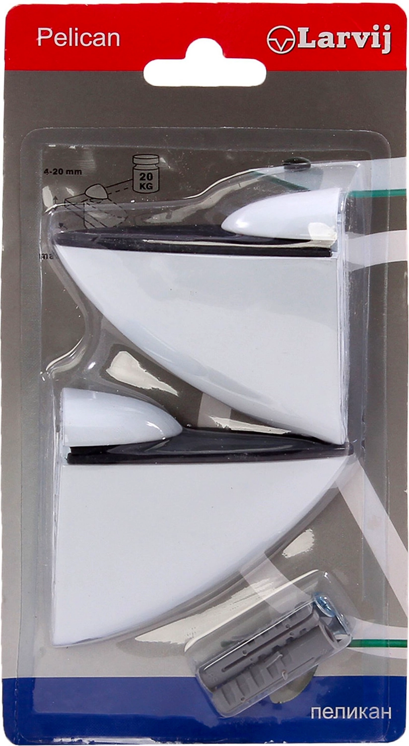 Декоративный полкодержатель конструкции Пеликан используется для крепления стеклянных и деревянных полок к стене. Позволяет регулировать толщину вставляемой полки от 4 до 24 мм, максимальная нагрузка 18 кг. Пеликаны Larvij комплектуются шурупами и дюбелями.