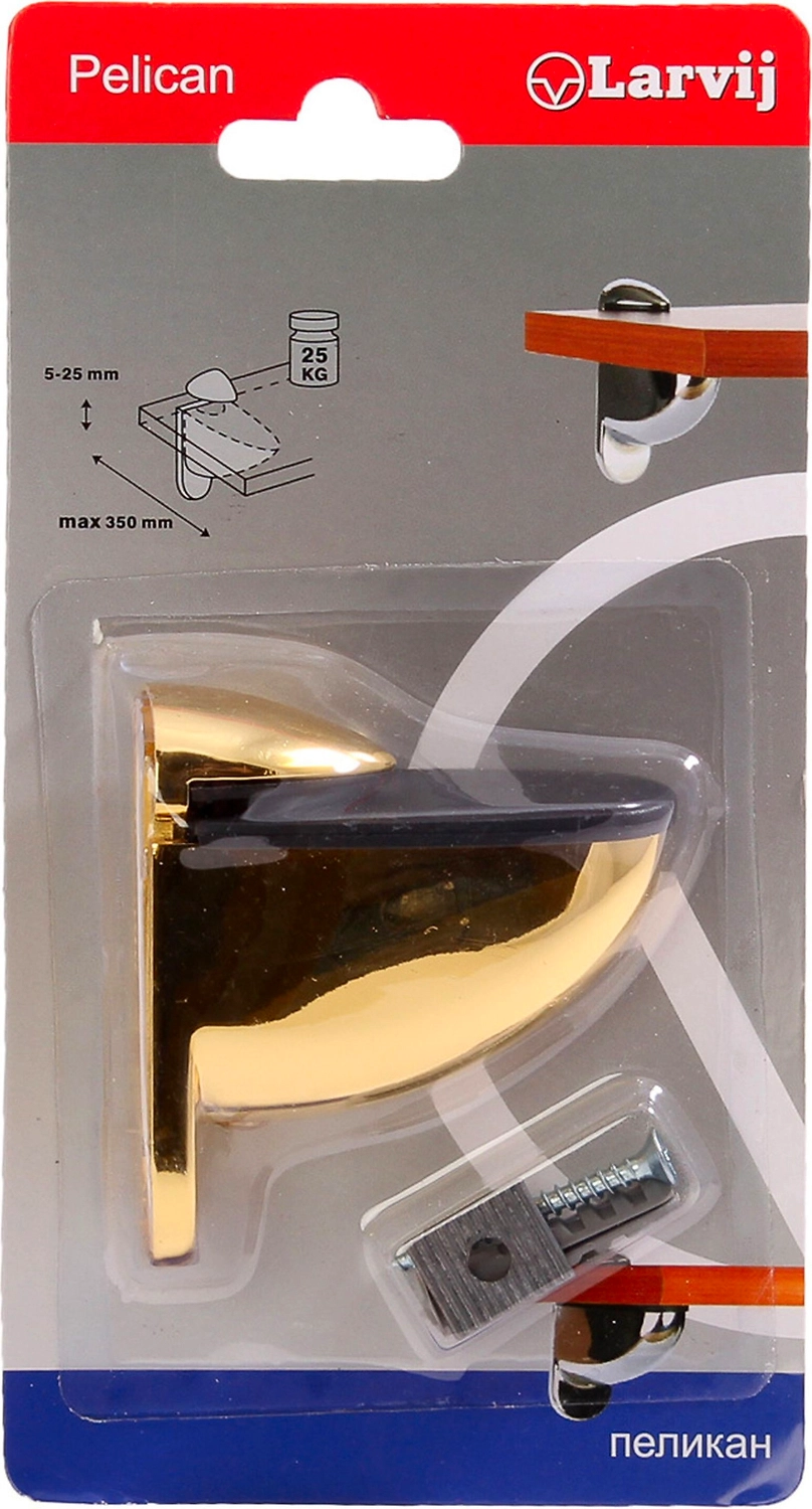 Декоративный полкодержатель конструкции Пеликан используется для крепления стеклянных и деревянных полок к стене. Позволяет регулировать толщину вставляемой полки от 4 до 24 мм, максимальная нагрузка 18 кг. Пеликаны Larvij комплектуются шурупами и дюбелями.