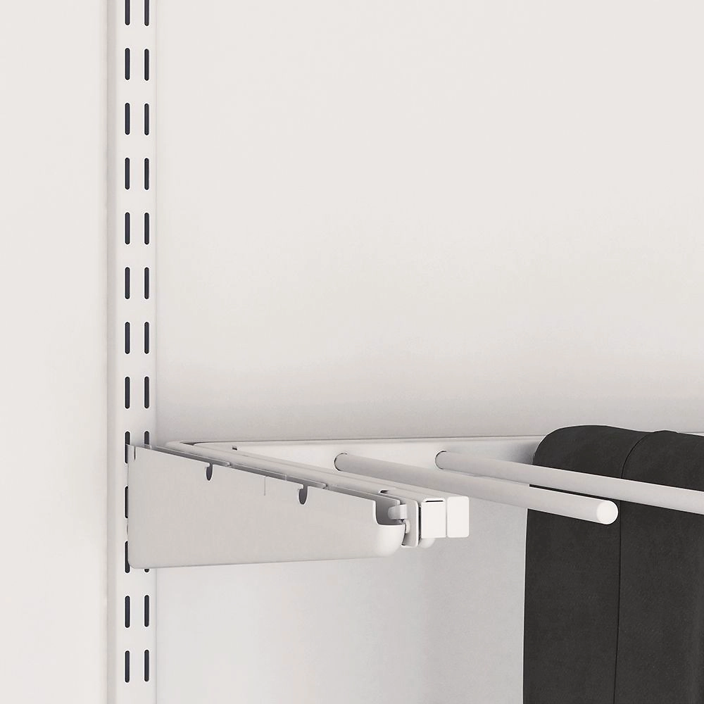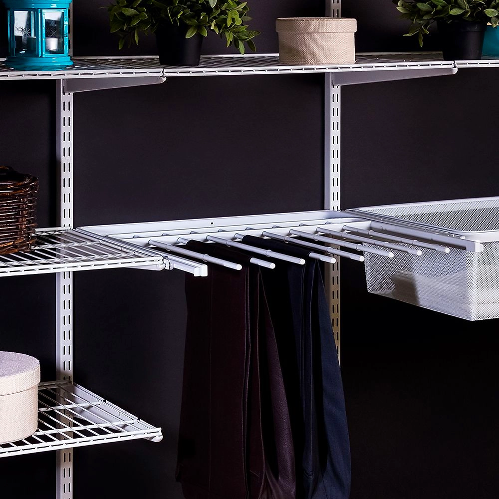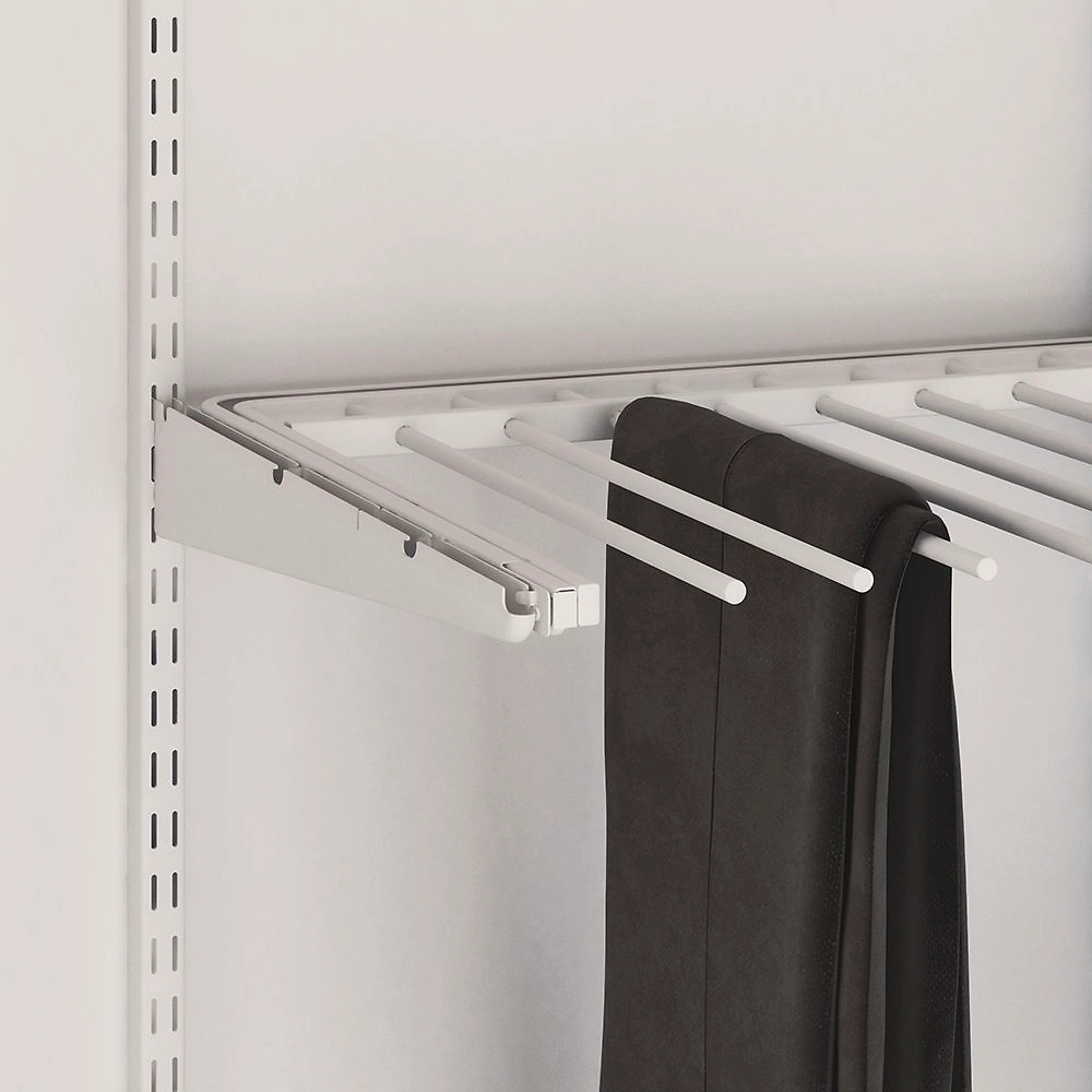 Брючница гардеробная представляет собой конструкцию с выдвижным механизмом и специальной плоскостью для размещения брючных изделий. Модель выполнена в классическом белом цвете.