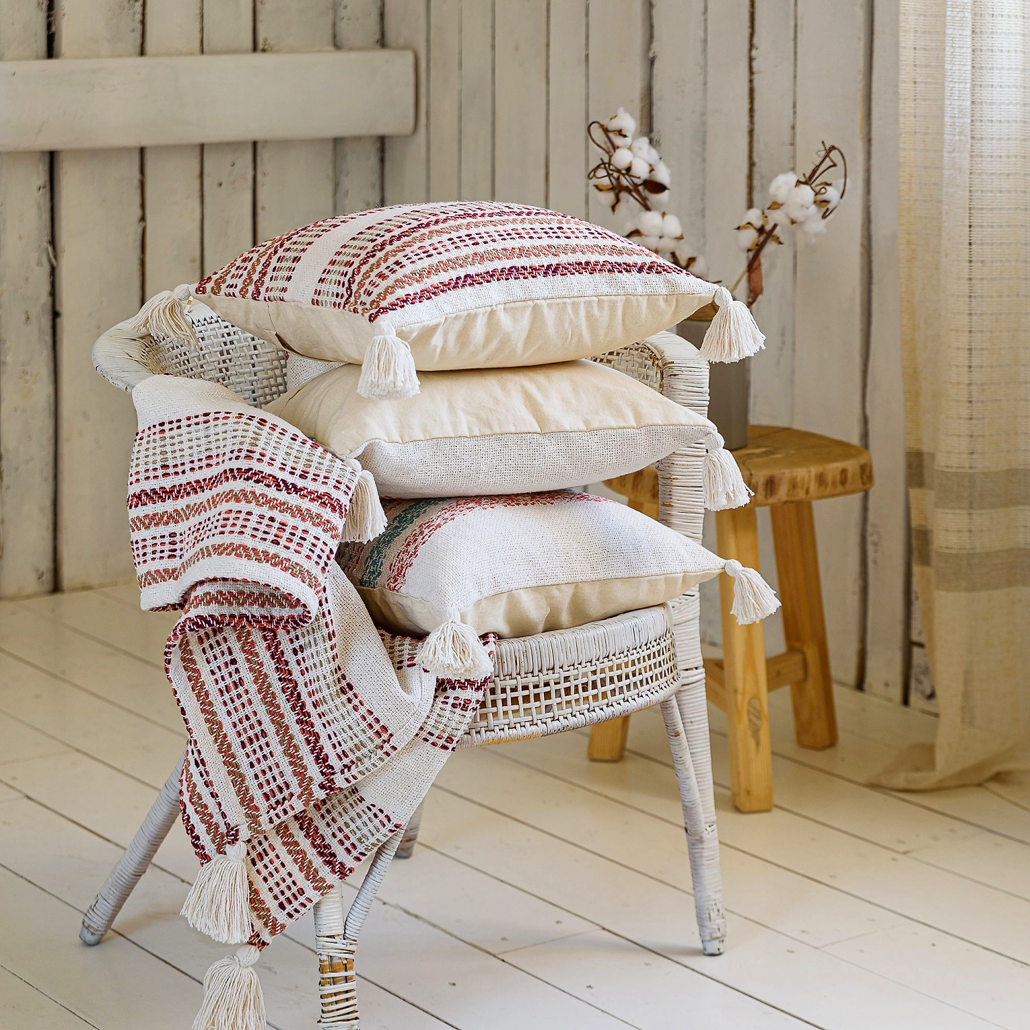 Декоративная подушка в полоску с кисточками по краям. Размер изделия: 40 х 40 см. Сделана из смеси хлопка и полиэстера, что делает её прочной и износостойкой. Съёмный чехол крепится при помощи застёжки-молнии, его можно стирать в машинке. Дизайн подушки в сочетании с другими аксессуарами коллекции Desert позволяет создать дома интерьер, вдохновлённый красками пустыни.