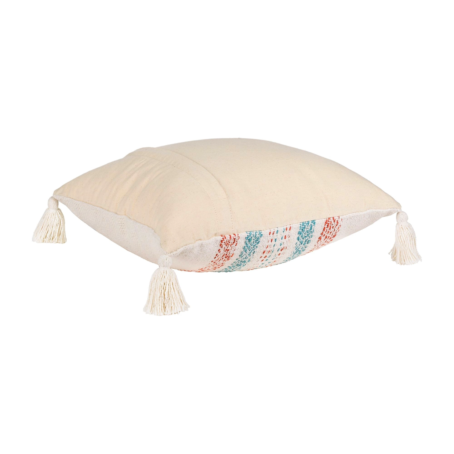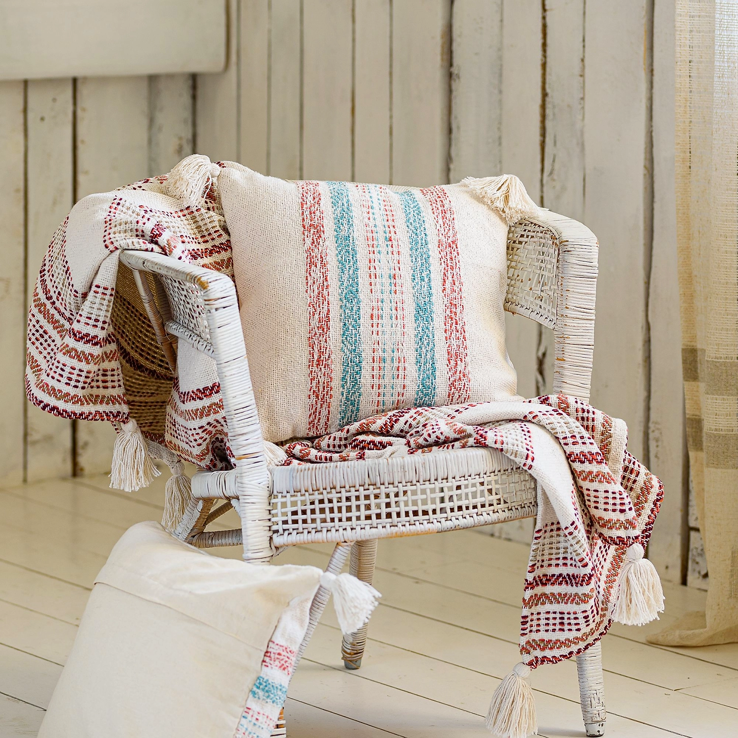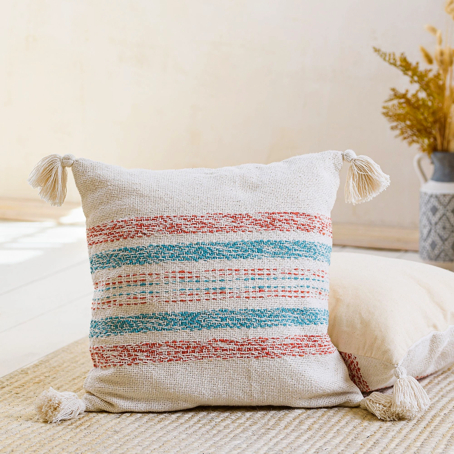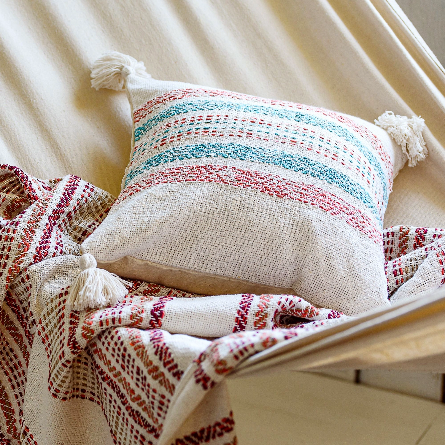 Декоративная подушка в полоску с кисточками по краям. Размер изделия: 40 х 40 см. Сделана из смеси хлопка и полиэстера, что делает её прочной и износостойкой.