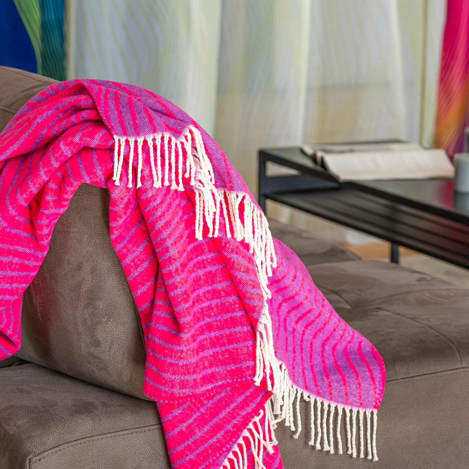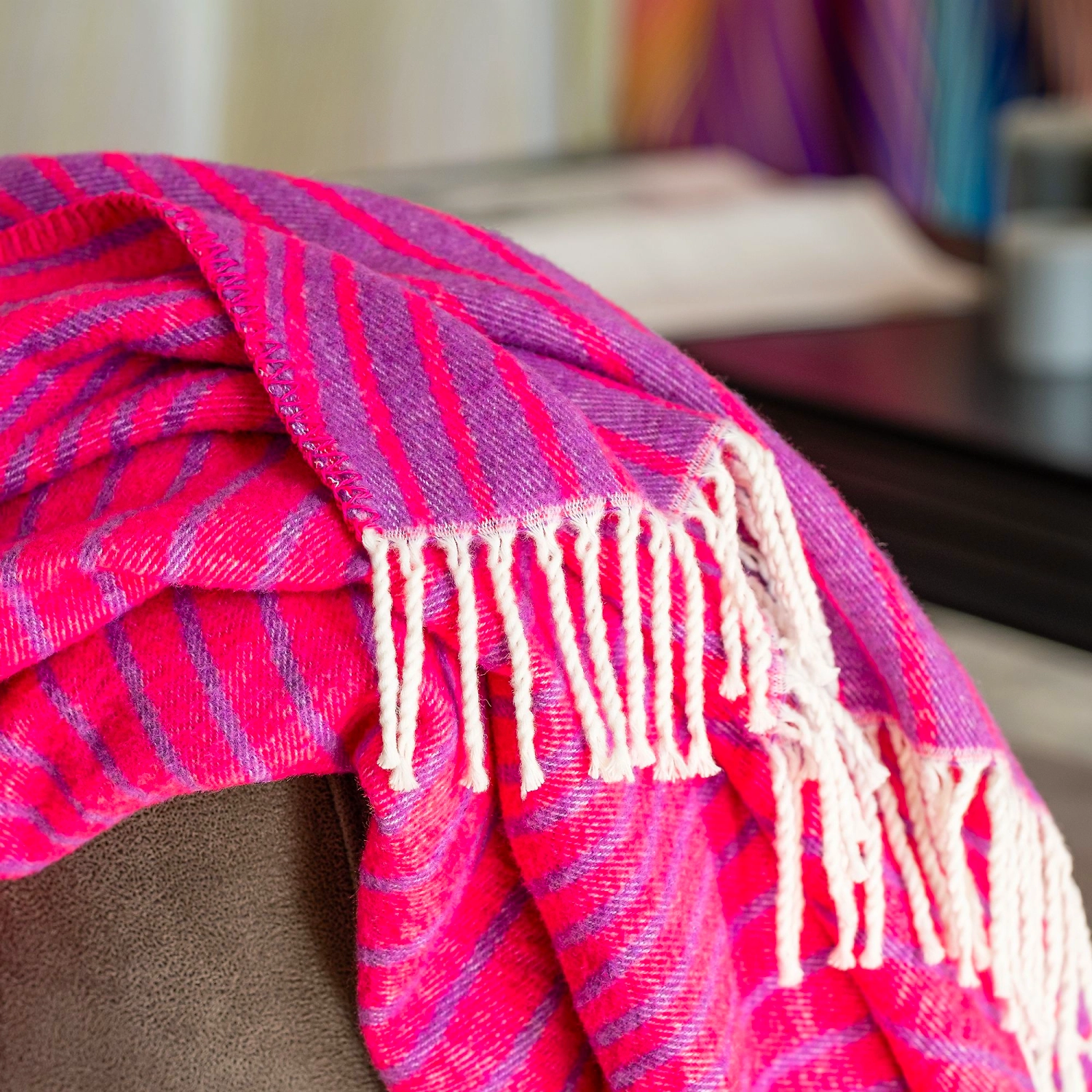 Плед розово-фиолетового цвета с полосами. Размер 110×170. Хлопковый. Приятный к телу и мягкий на ощупь, не вызывает аллергических реакций. Неприхотлив в уходе, его можно стирать в машинке с соблюдением температурного режима. Сохраняет первозданный внешний вид после большого количества стирок. Яркая расцветка и оригинальный дизайн изделия в стиле оптической иллюзии оживит практически любой современный интерьер. Плед идеально сочетается с другими аксессуарами из коллекции Karim.