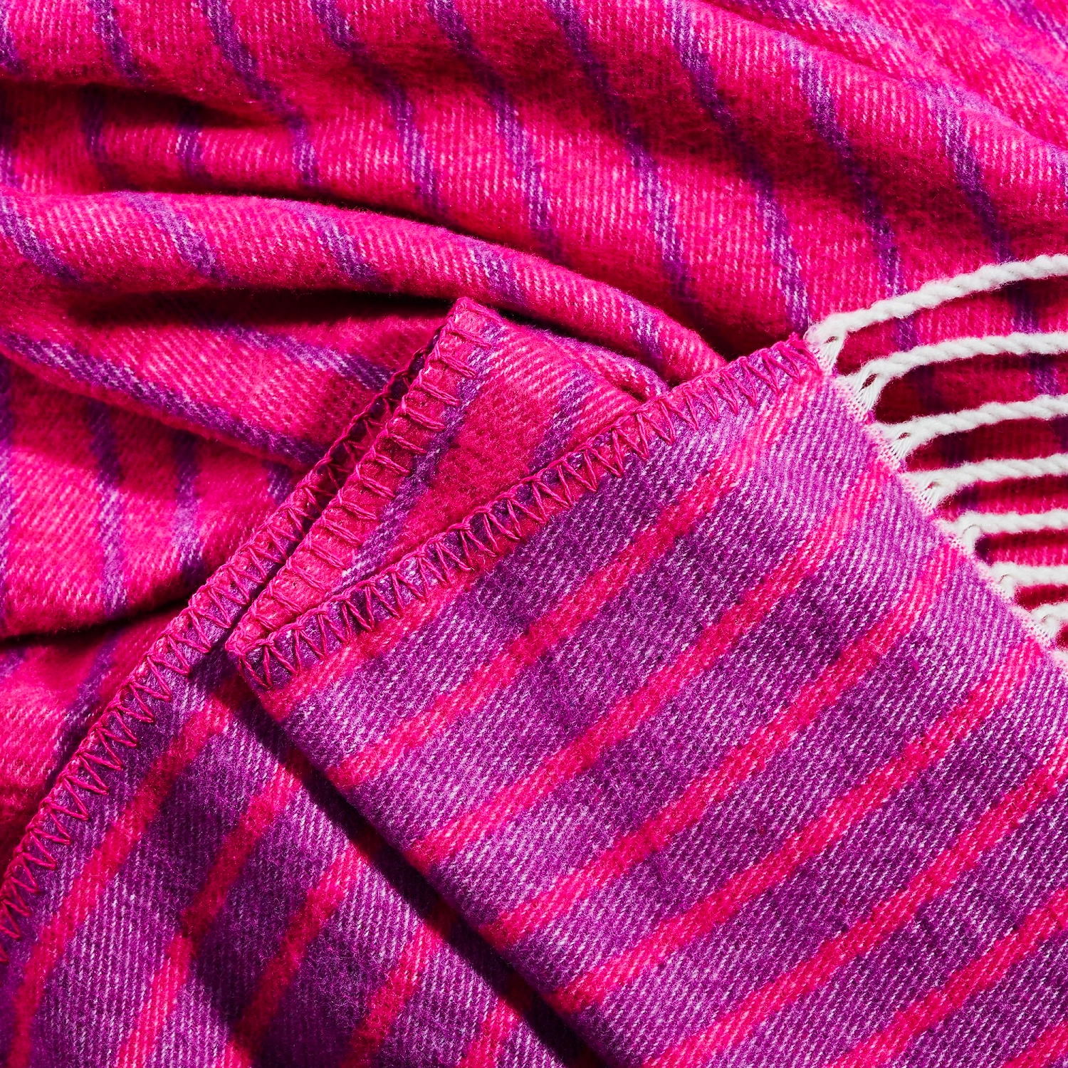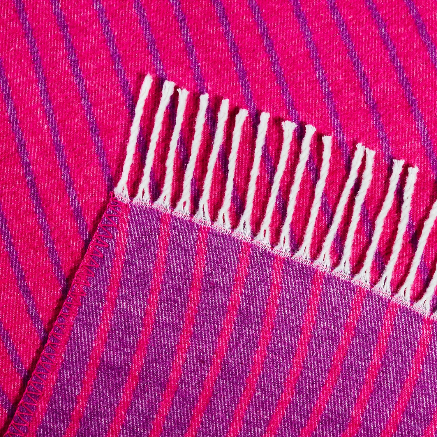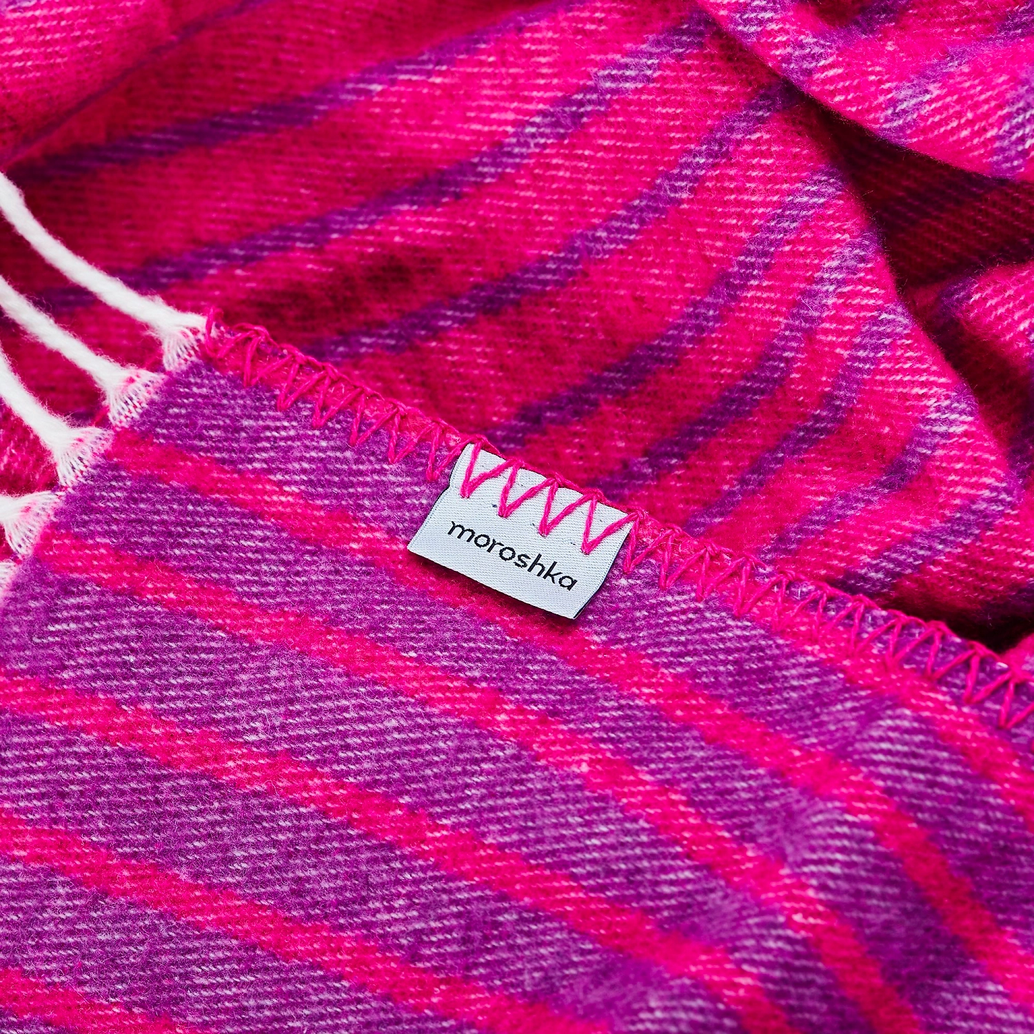 Плед розово-фиолетового цвета с полосами. Размер 110×170. Хлопковый. Приятный к телу и мягкий на ощупь, не вызывает аллергических реакций.