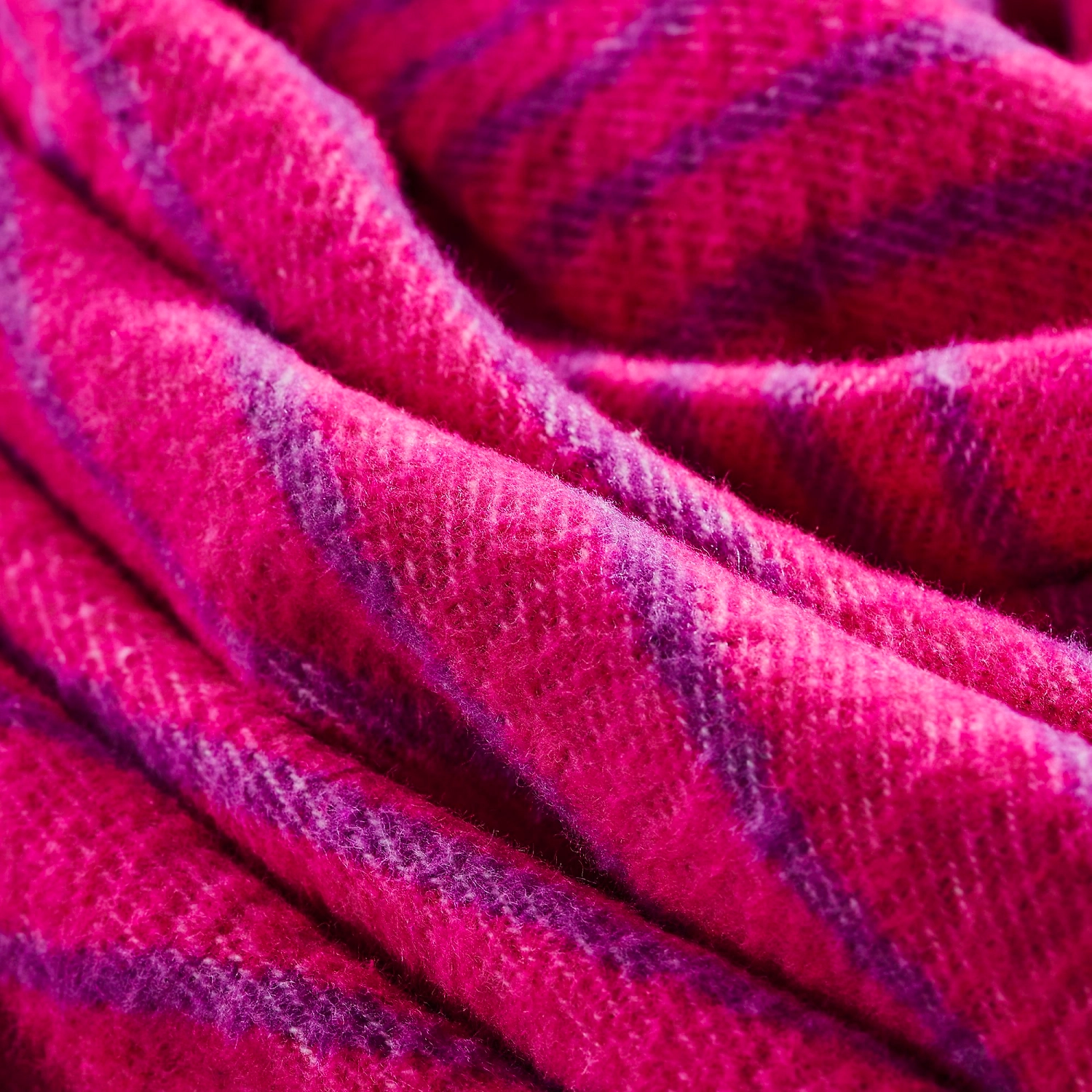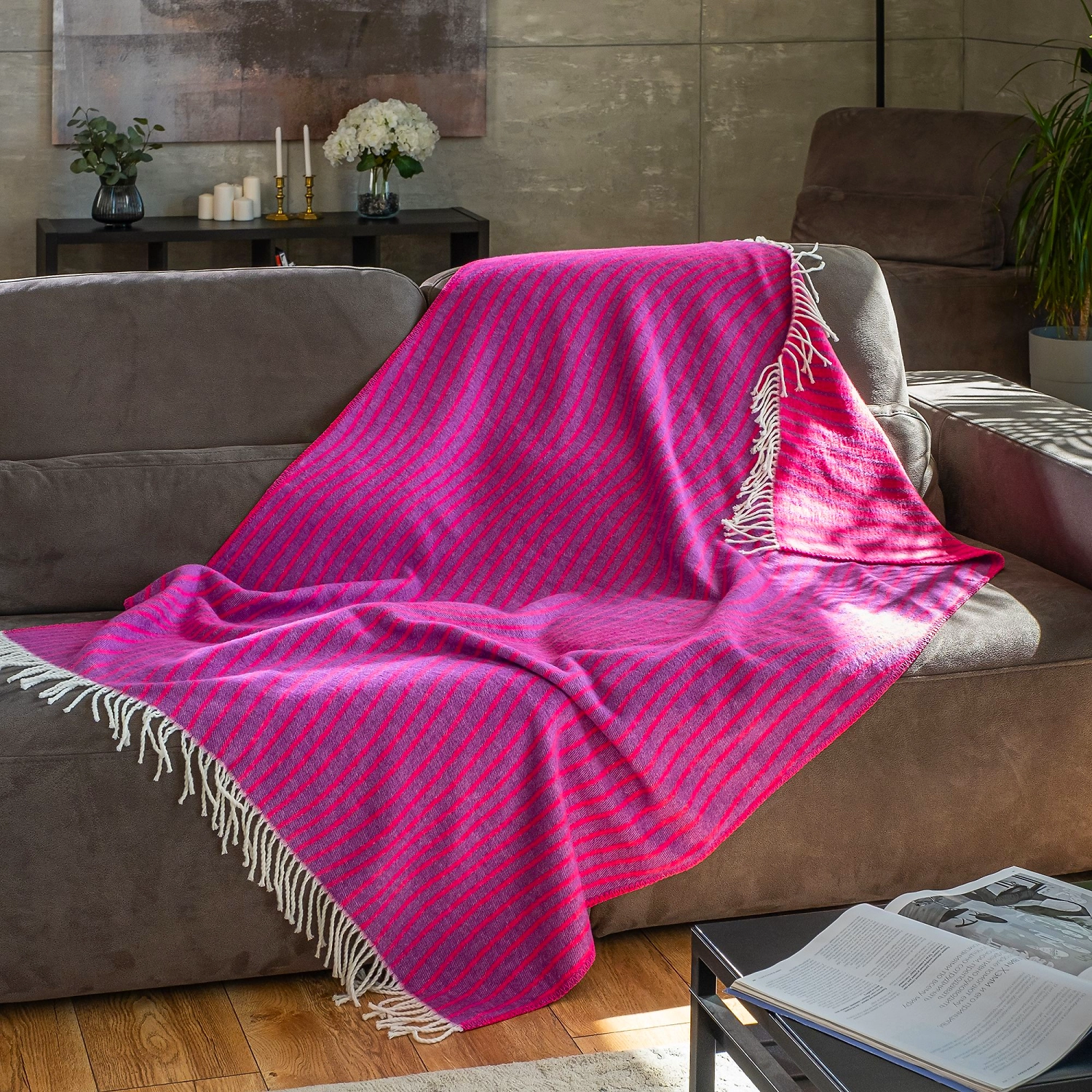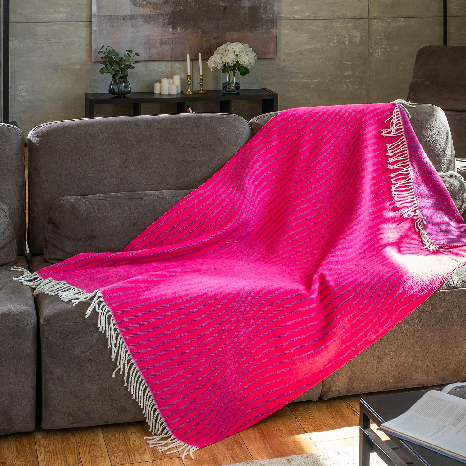 Плед розово-фиолетового цвета с полосами. Размер 110×170. Хлопковый. Приятный к телу и мягкий на ощупь, не вызывает аллергических реакций.