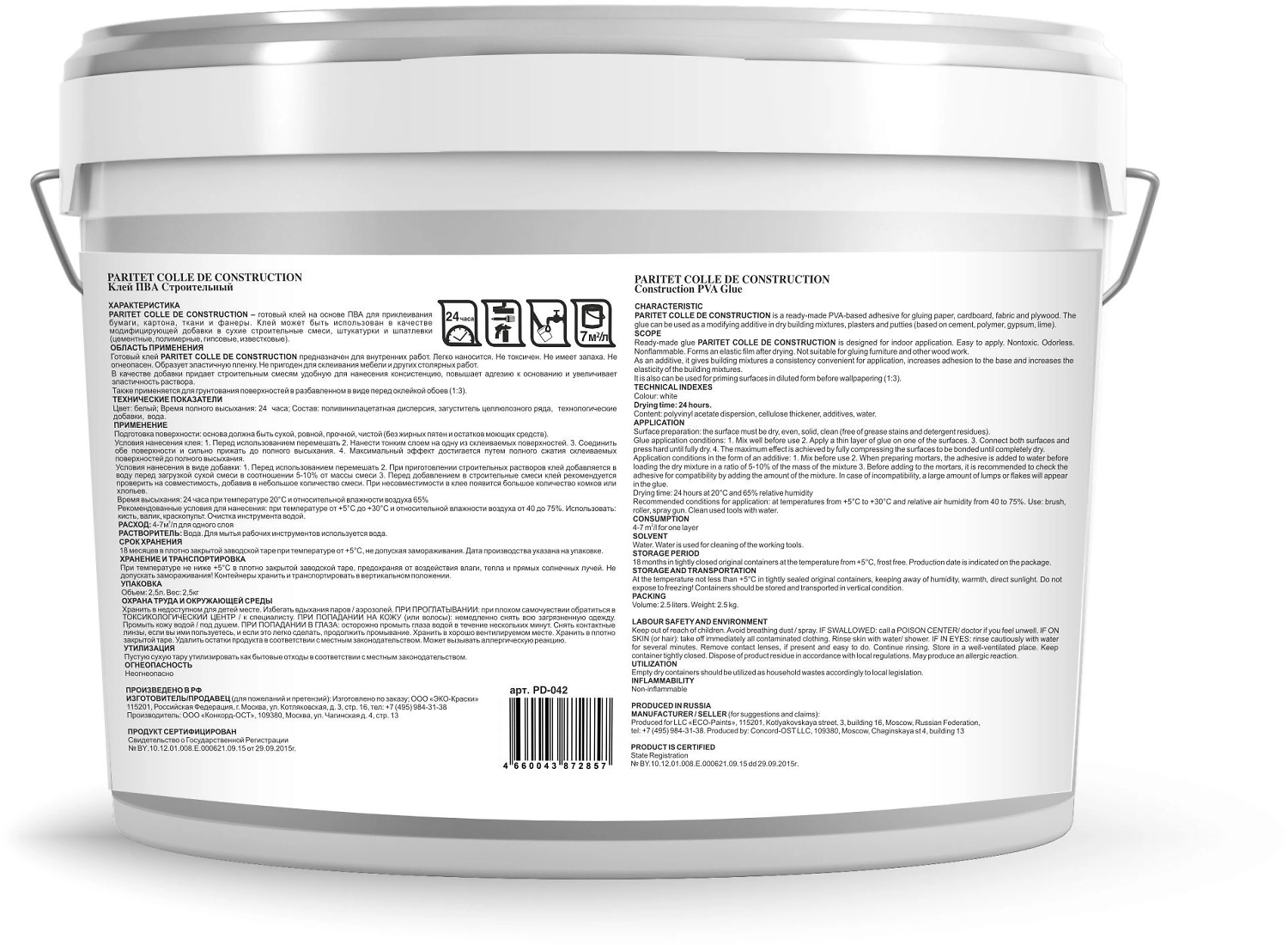 Готовый клей на основе ПВА для приклеивания бумаги, картона, ткани и фанеры. Клей может быть использован в качестве модифицирующей добавки в сухие строительные смеси, штукатурки и шпатлевки (цементные, полимерные, гипсовые, известковые).ОБЛАСТЬ ПРИМЕНЕНИЯ Готовый клей PARITET COLLE DE CONSTRUCTION предназначен для внутренних работ. После высыхания образует тонкую эластичную прозрачную пленку. Легко наносится. Не токсичен. Не имеет запаха. Не огнеопасен. Образует эластичную пленку. Не пригоден для склеивания мебели и других столярных работ.В качестве добавки придает строительным смесям удобную для нанесения консистенцию, повышает адгезию к основанию и увеличивает эластичность раствора.Также применяется для грунтования поверхностей в разбавленном в виде перед оклейкой обоев (1:5).ТЕХНИЧЕСКИЕ ПОКАЗАТЕЛИ Цвет: белый Время полного высыхания: 24 часа;Состав: поливинил ацетатная дисперсия, загуститель целлюлозного ряда, технологические добавки, вода.
